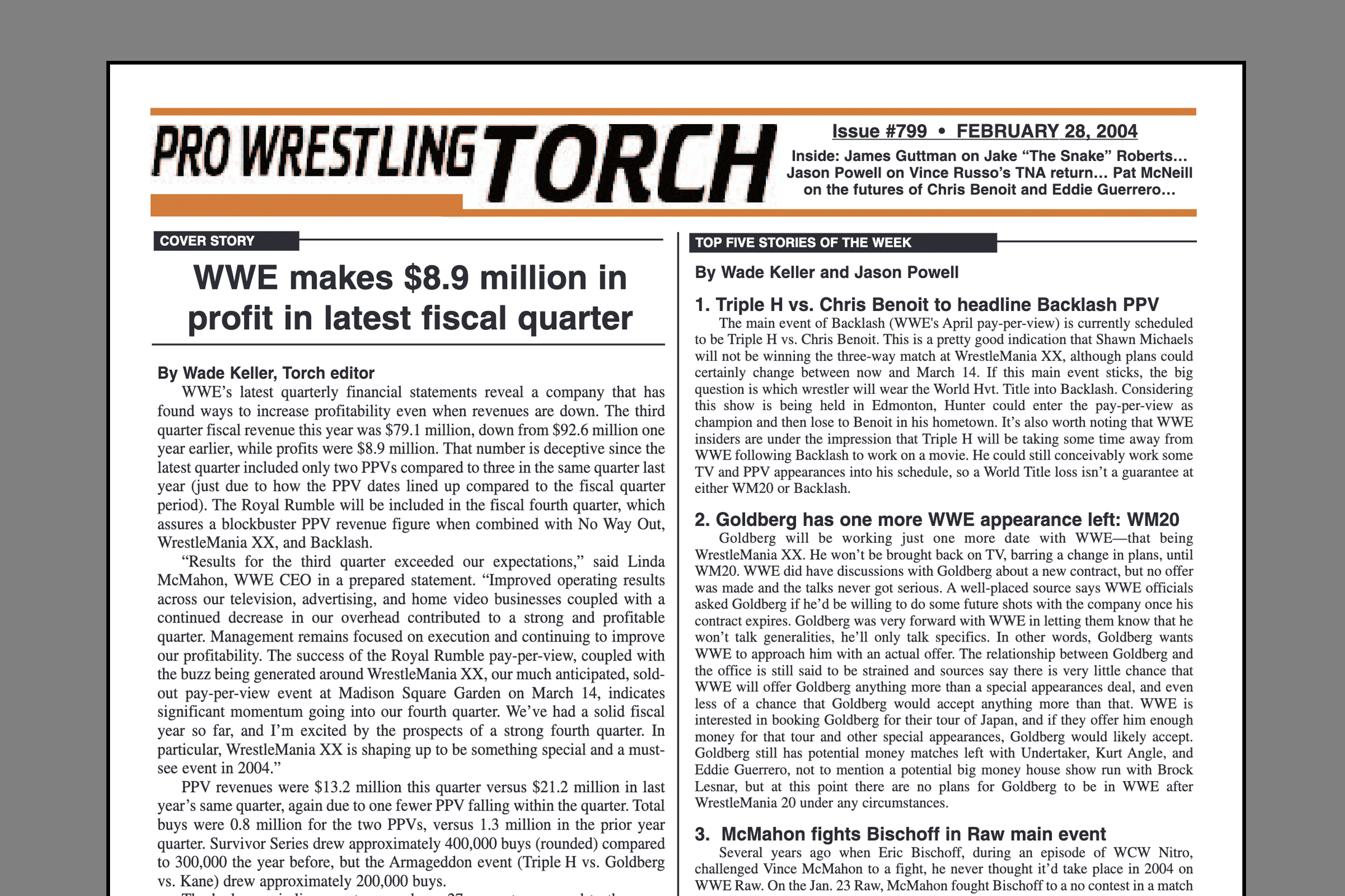 SUMMARY of #799 cover-dated February 28, 2004: Cover Story by Wade Keller looking at the latest WWE financial statement… The Top Five Stories of the Week… WWE Newswire: All the latest behind the scenes news and info – by far the no. 1 source for insider news on WWE each week… TNA Newswire: All the latest behind the scenes news and info – by far the no. 1 source for insider news on TNA each week… Jason Powell’s weekly “On Topic” column with a proposal for how TNA could capitalize on Vince Russo as the new Director of Authority by sending TNA fans a message of change… Torch Talk with Bill Apter, pt. 6: Ever wondered why the PWI family of newstand magazines never went “smart” with their coverage? Apter discusses that in this week’s installment, plus addresses the shock of the WWF revoking press credentials around the time Vince Jr. took over for his father, and how his father reacted to the changes… Pat McNeill’s “McNeill Factor” explaining why Eddie Guerrero’s top tier push will last longer than Chris Benoit’s… Bruce Mitchell’s Memo titled: “WrestleMania is Building From Real Signs of Hope”… James Guttman’s feature column titled: “Feeding the Snake… and WM’s Least Memorable Moments” with a feature story on Jake Roberts’s career and a listing of Guttman’s least memorable WM moments of all time… Wade Keller’s “End Notes” with an essay comparing how TNA and ROH both feature their two main singles titles, who does it better, and how the weaker promotion can change with one simple proclamation and rule change… ROH and ETC. Newswire, putting ROH’s week into perspective in one article… Plus, the NWA-TNA PPV Report, a Backtrack feature looking at the Torch Newsletter 10 Years Ago This Week, the Weekly Schedule…