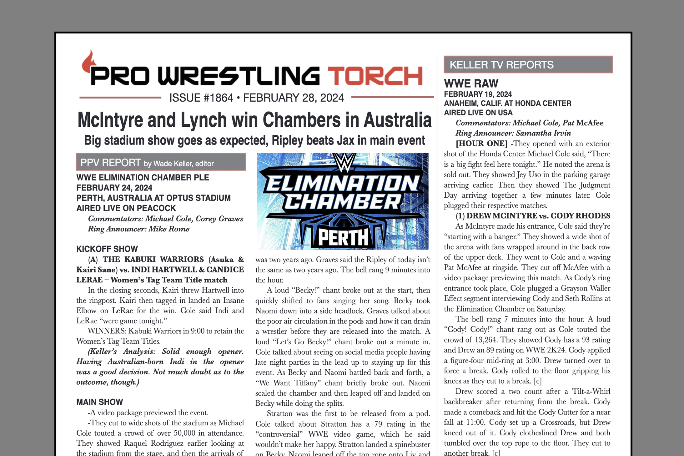 SUMMARY: This week’s PWTorch Newsletter features Wade Keller’s WWE Elimination Chamber Report… Greg Parks column reviewing new Ric Flair book… Keller’s TV Reports…More…