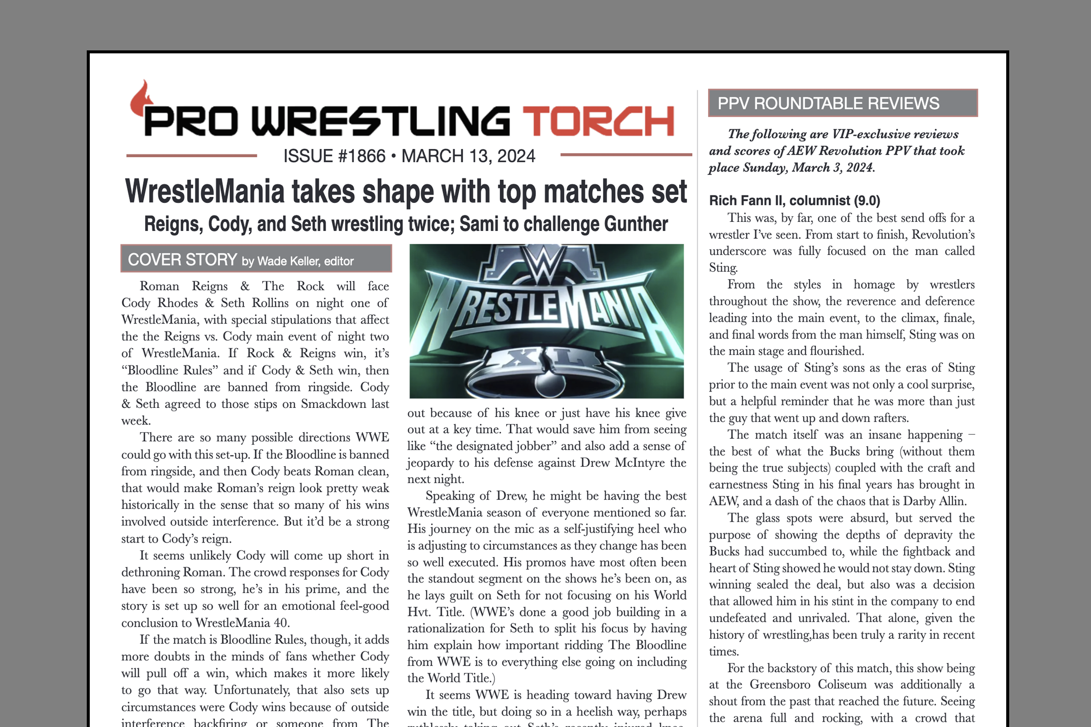 SUMMARY: This week’s PWTorch Newsletter features Wade Keller’s Cover Story on WrestleMania 40 main events taking shape… Greg Parks column looks at latest NXT call-ups… AEW Revolution PPV Roundtable Reviews pt. 1… Keller’s TV Reports… Torch Newswire… More…