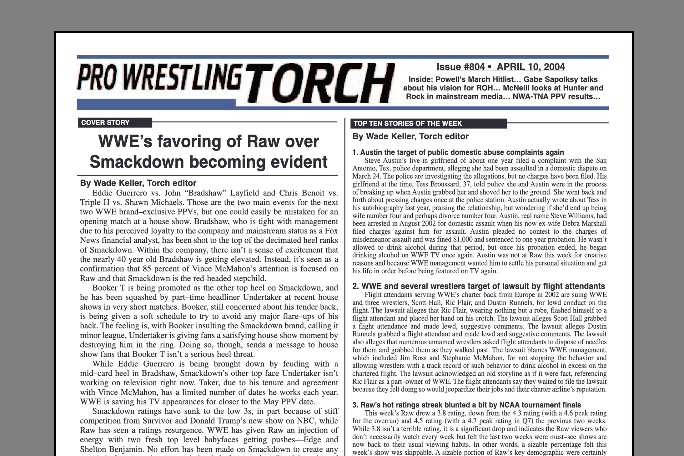 SUMMARY of #804 cover-dated April 10, 2004: This week’s Torch Newsletter includes a cover story on WWE favoring Raw over Smackdown… The Top Five Stories of the Week include Steve Austin the target of public domestic abuse complaints again, plus flight attendance lawsuit, Raw ratings, ROH-TNA, and more… The WWE Newswire including a potential Tuesday night PPV in the works… The TNA Newswire includes near confirmation of a Fox Sports deal being completed… Jason Powell’s “On Topic” features the March Hitlist… Wade Keller’s “This Week” columns criticized The Rock for how he handled pro wrestling questions on David Letterman’s show… Pat McNeill’s “McNeill Factor” covers The Rock on Howard Stern and a Triple H interview… Torch Talk with Gabe Sapolsky, pt. 3, includes his comments about how much he loves booking ROH… Plus Mitchell’s Memo, a TNA PPV Report, Live Event Results, Backlash, Wade Keller’s End Notes featuring Random Thoughts, and more…