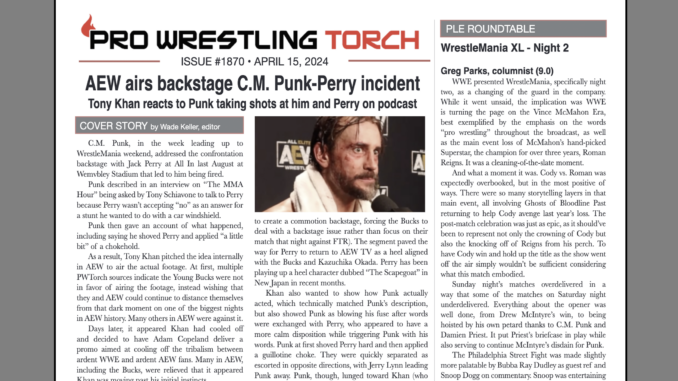 SUMMARY: This week’s PWTorch Newsletter features Wade Keller’s cover story on the C.M. Punk-Jack Perry backstage footage airing on Dynamite… WrestleMania 40 Night 2 Roundtable Reviews… Greg Parks column on WM fashion… Keller’s TV Reports… Torch Newswire… More…