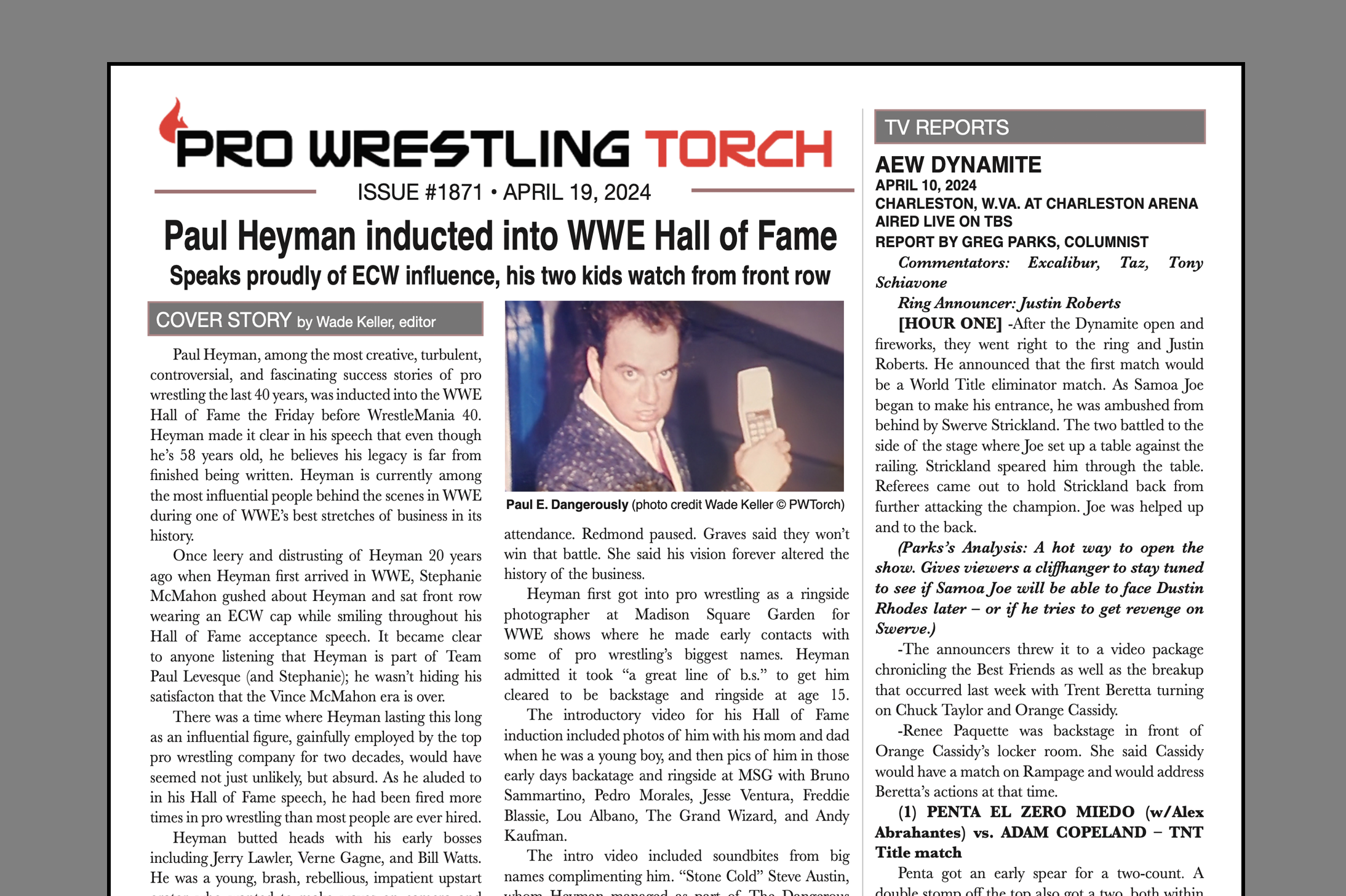 SUMMARY: This week’s PWTorch Newsletter features Wade Keller’s cover story on Paul Heyman’s WWE Hall of Fame speech… Greg Parks column on WrestleMania weekend’s best matches… Keller’s TV Reports… Torch Newswire… More…