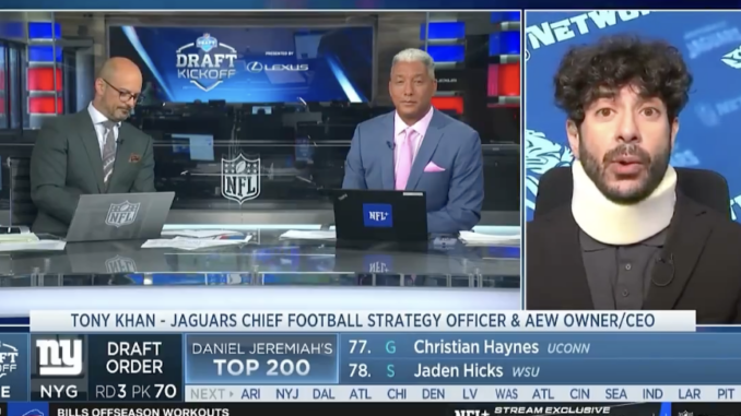 Tony Khan appeared on NFL Network with a neck brace and discussed being the target of an attack by The Young Bucks, Kazuchika Okada, and Jack Perry. When the hosts said he took a Meltzer Driver, Khan said the Bucks changed the name months ago to the Tony Khan Driver. “Maybe I should have seen it coming, in hindsight,” he said. He said he has a complicated relationship with the Bucks and Jack Perry.