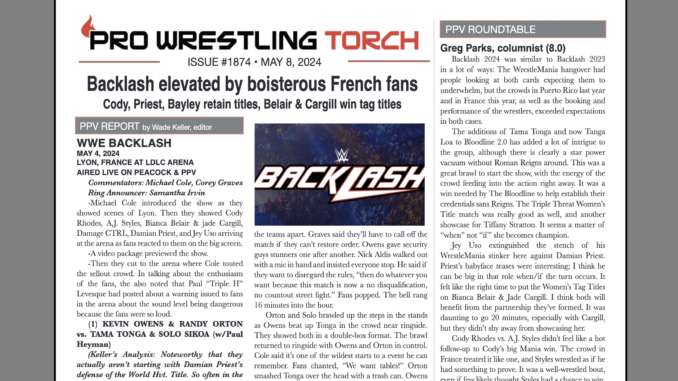 VIP NEWSLETTER – PRO WRESTLING TORCH #1874 (May 8, 2023): Keller’s report on WWE Backlash, Roundtable Reviews, Parks column looks back at last year’s WWE Draft, Newswire, TV Reports