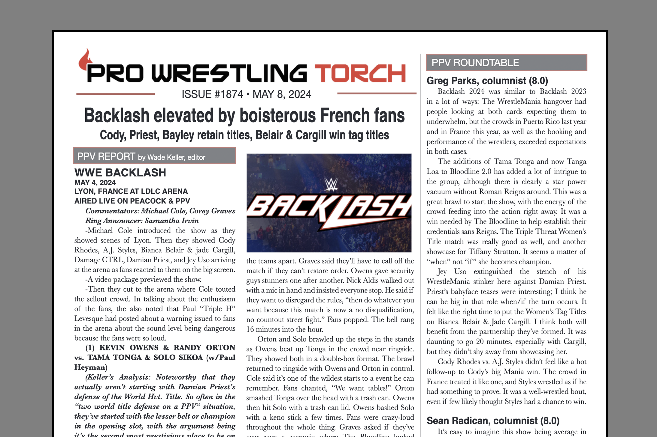 SUMMARY: This week’s PWTorch Newsletter features Wade Keller’s report with newsletter-exclusive star ratings on WWE Backlash… Staff Roundtable Reviews with scores… Greg Parks column looking back at last year’s WWE Draft… Keller’s TV Reports… Torch Newswire… More…