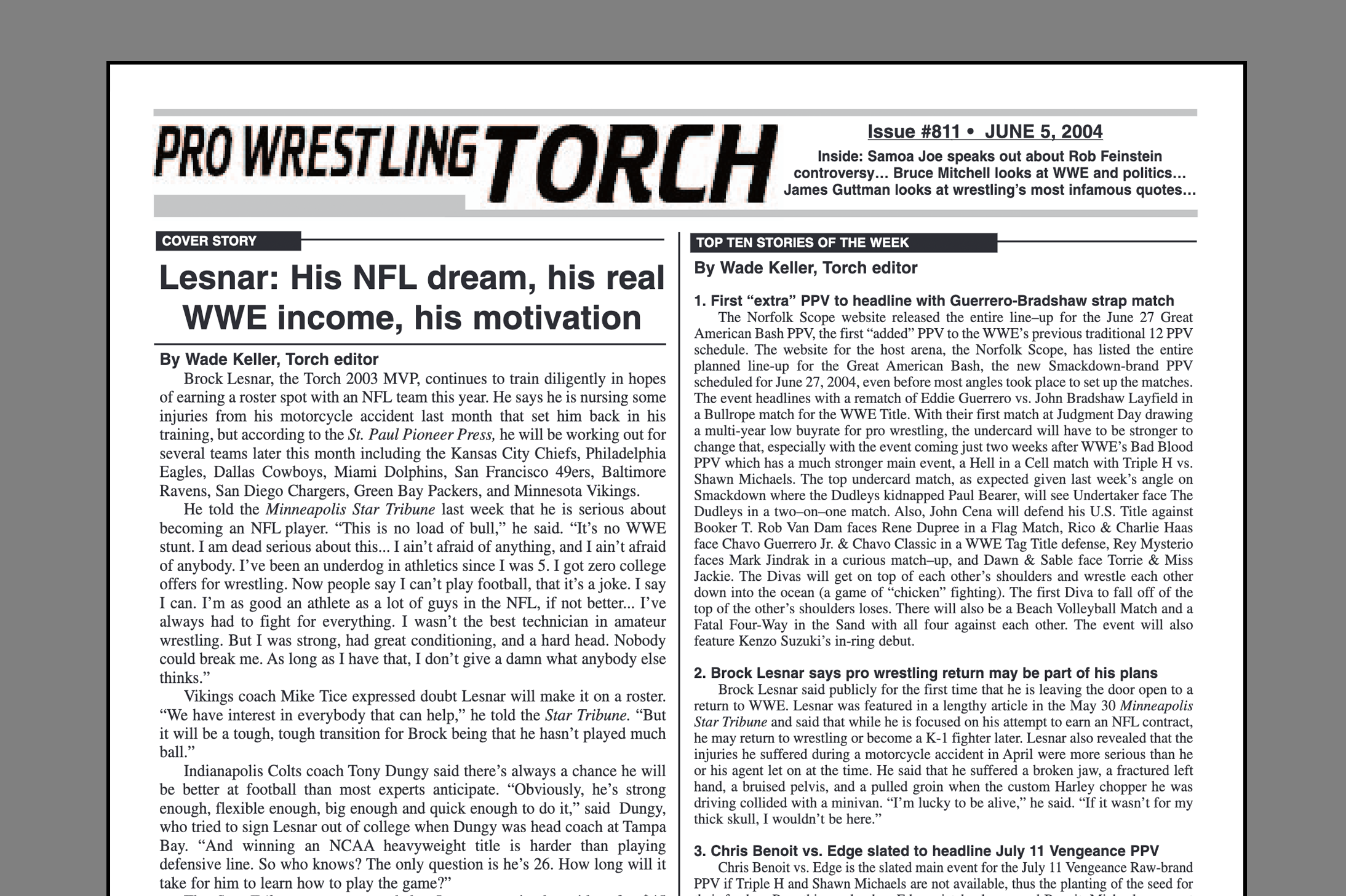 VIP 2004 BACK ISSUE – Pro Wrestling Torch #811 (June 5, 2004): Cover Story on Brock Lesnar, Pro Wrestling’s Ten Most Infamous Quotes pt. 1, Powell’s May Hitlist, Newswires, more