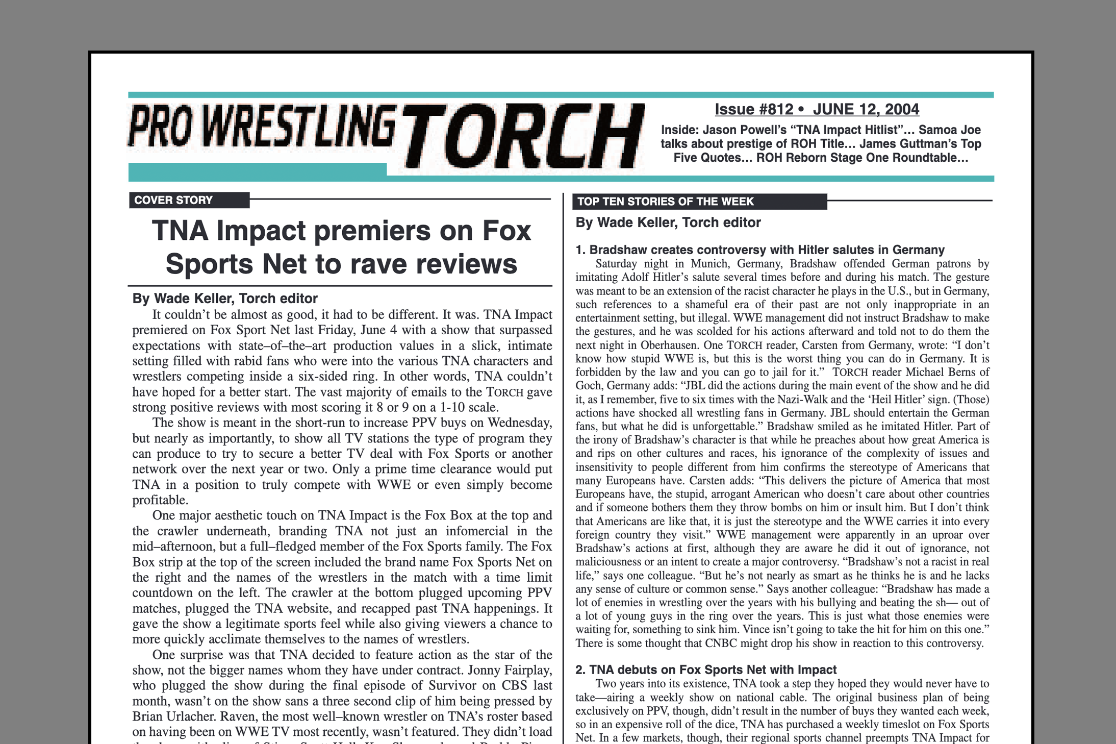 SUMMARY of #812 cover-dated June 5, 2004: This week’s articles include: The Top Five Stories of the Week with new details on the Bradshaw controversy…. WWE Newswire with tons of backstage first-generation insider news on Undertaker, Eddie Guerrero, Bradshaw, the Smackdown roster’s morale, Mordecai, SummerSlam, Bad Blood, Great American Bash, Nunzio, Brock Lesnar, Triple H, Paul London, Matt Hardy, Rikishi, Kidman, Sable, and much more… TNA Newswire, our longest ever, with tons of unreported backstage details on the biggest week in TNA history… Jason Powell’s “On Topic” feature column with his “TNA Impact Hitlist” detailing what worked and didn’t work on the first show… Part six of the critically acclaimed Samoa Joe “Torch Talk” with his perspective on the TNA-ROH war and whether jealousy or good business fueled recent decisions, whether he’d like to work for TNA, and the pride he takes in his long ROH World Title reign and bringing that belt to legit World Title status… 10 Years Ago Torch Backtrack with our Cover Story on one of the biggest stories of the ’90s – Hulk Hogan signing with WCW… ROH New Video Release: Roundtable Reviews of ROH Reborn Stage One with reviews and scores from Wade Keller, Bruce Mitchell, Pat McNeilll, and Sean Radican… And more!