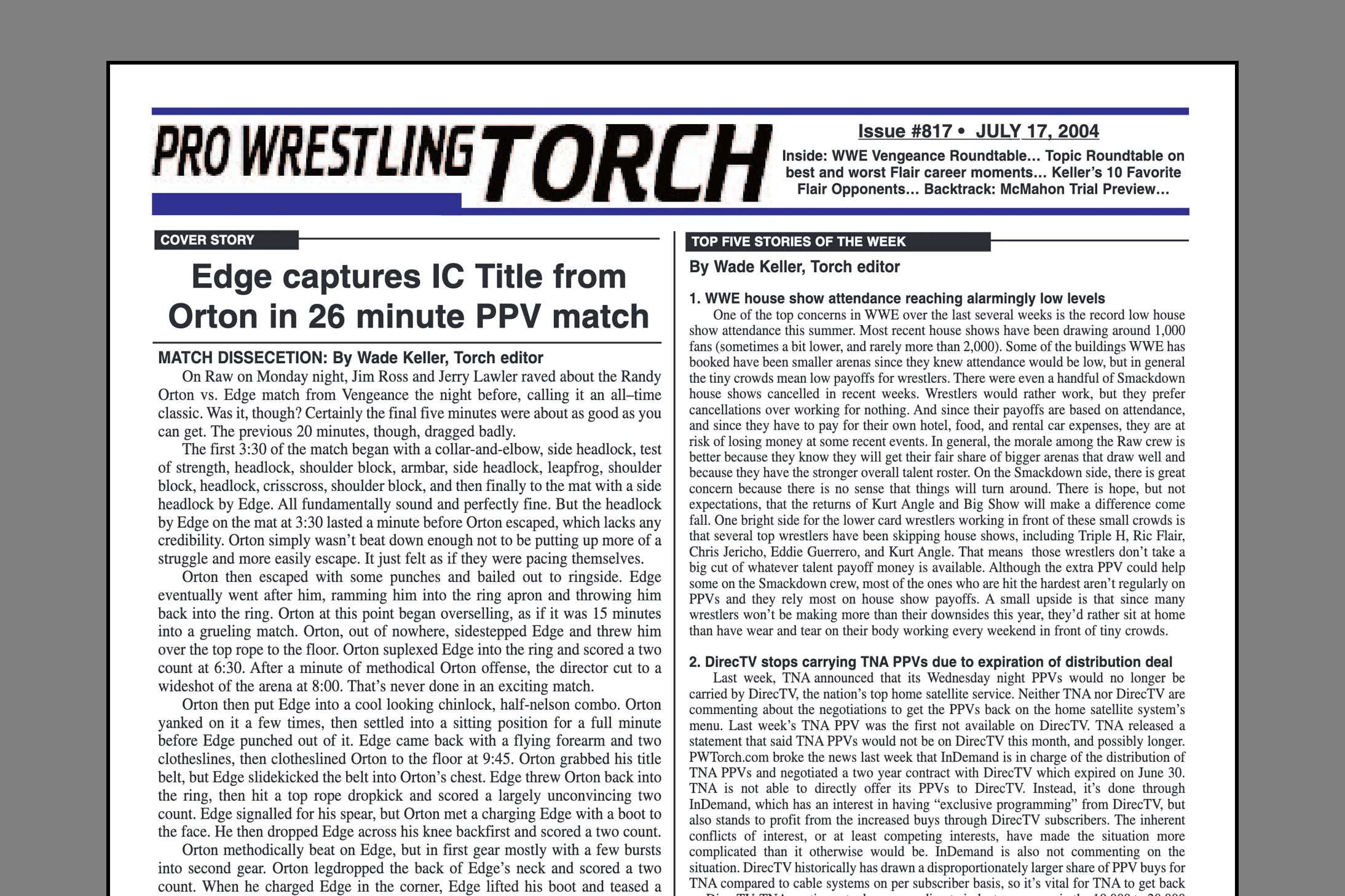 SUMMARY of #817 cover-dated July 17, 2004: This week’s Torch Newsletter includes a Cover Story “Match Dissection” the Randy Orton vs. Edge “classic”… Pat McNeill’s “At the Bar for Vengeance” column… Jason Powell’s “On Topic” featuring an in-depth look at Smackdown’s Feuds… Wade Keller’s “Favorite All-Time 10 Ric Flair Opponents”… Torch Topic Roundtable where each Torch staffer offers their picks for the highest and lowest points in Ric Flair’s career… The WWE Vengeance Roundtable Reviews… Wade Keller’s “End Notes” looking at the potential of Jeff Hardy working full-time in TNA… Backtrack with a Jim Ross Torch Talk item, a preview of the Vince McMahon trial, and more… Plus the in-depth insider WWE Newswire, TNA Newswire, and ROH Newswire sections… Summaries of Raw, Smackdown, TNA PPV, and TNA Impact… WWE Event Results… And More…