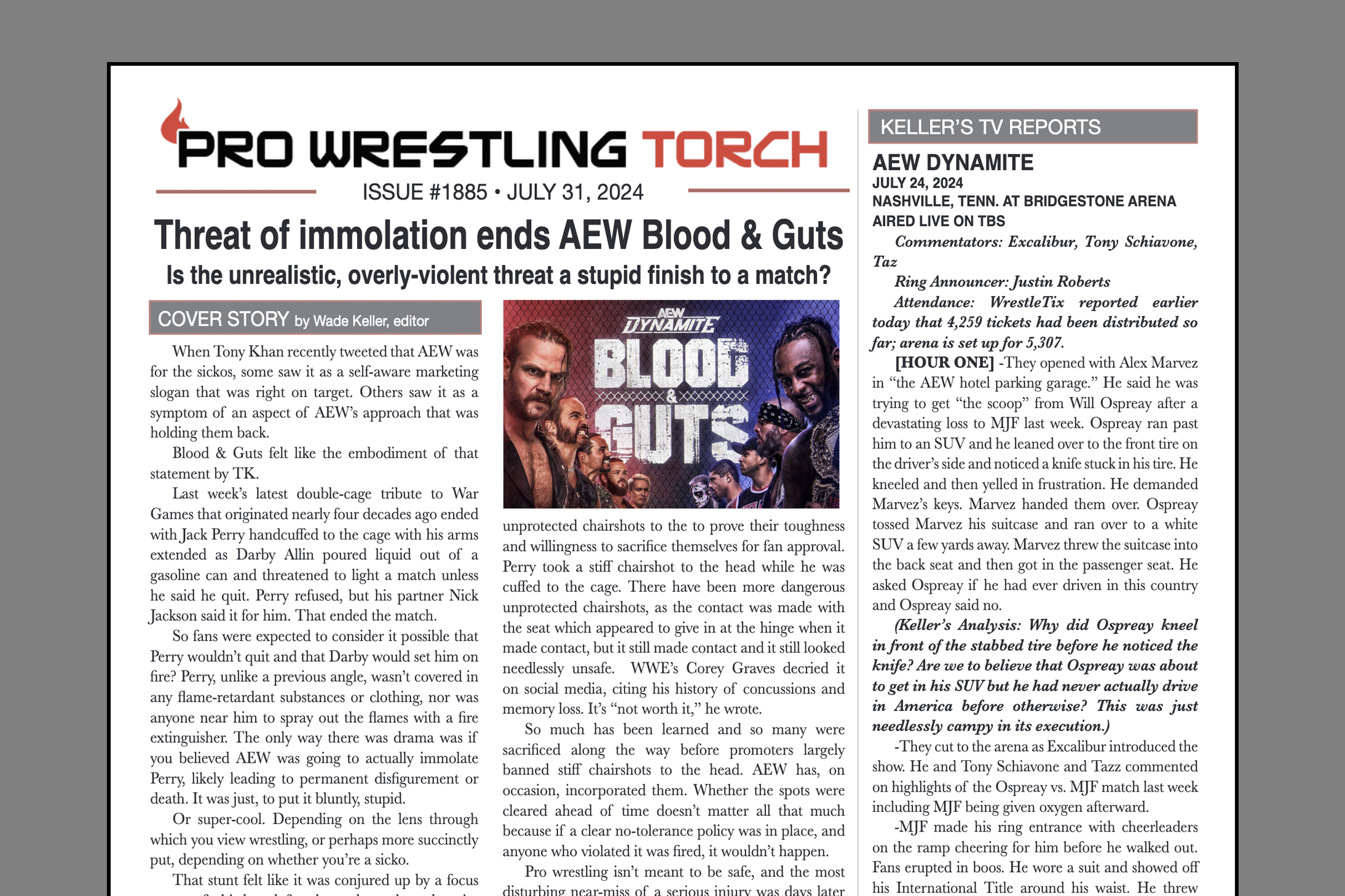 SUMMARY: This week’s PWTorch Newsletter features Wade Keller’s cover story on the AEW Blood & Guts finish and unprotected chairshot to head… Greg Parks column on TNA PPV… Sean Radican’s New Japan G1 Report… Keller’s TV reports… More..