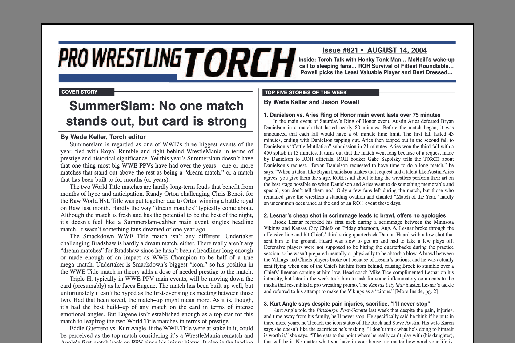 SUMMARY of #821 cover-dated August 14, 2004: This week’s Torch Newsletter includes a Cover Story previewing Summerslam… The Top Five Stories of the Week with comparisons between book sales for Ric Flair, Steve Austin, and Hulk Hogan… The WWE Newswire, TNA Newswire, and ROH Newswire… Jason Powell’s “On Topic” features his picks for the Least Valuable Players and Best Dressed in Wrestling… Pat McNeill’s “McNeill Factor” looks at what the fair weather fans from wrestling’s boom period have been missing this year… Part two of the “Torch Talk” with Honky Tonk Man with details of why he’s turned down offers to be part of WWE again… ROH Survival of the Fittest covered with a Keller’s Match Report and Roundtable Reviews from Wade Keller, Pat McNeill, James Guttman, Derek Burgan, and Sean Radican… End Notes with Wade Keller’s random thoughts… Mitchell’s Memo featuring his review of a new wrestling book… Plus TV Results, Live Event Results, the Weekly Schedule, and more…