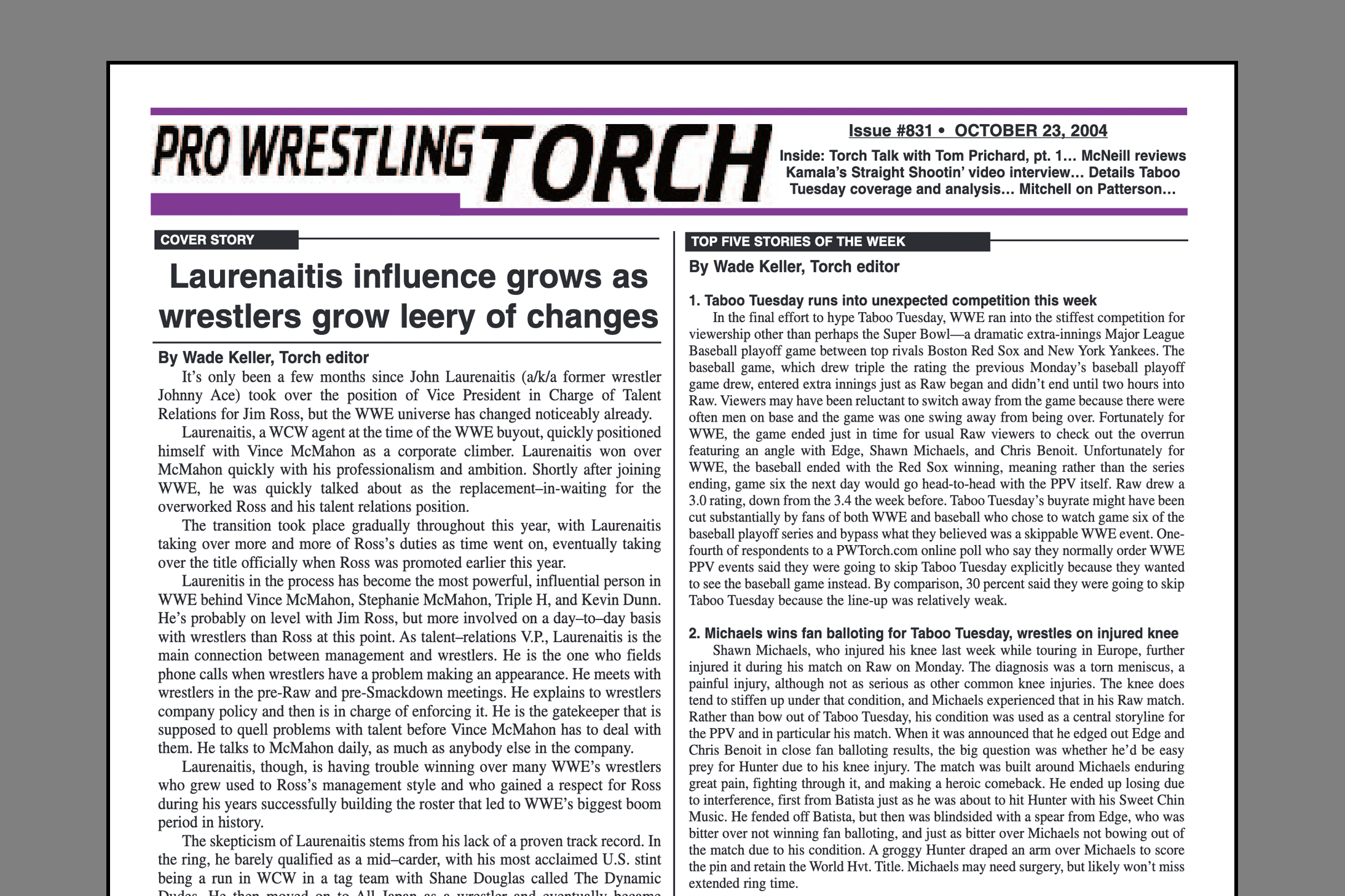 SUMMARY of #831 cover-dated October 23, 2004: This issue includes a Cover Story featuring an-depth look at how wrestlers are reacting to John Laurenaitis replacing Jim Ross as V.P. of talent relations with tons of backstage insight into the situation… The Top Five Stories of the Week including WWE in Europe, Raw Being Shopped… WWE Newswire – Tons of details on Tough Enough tryout weekend… TNA Newswire – News on Hall and Nash contract status and booking changes… Bruce Mitchell’s Memo: 10 Questions with Pat Patterson… Jason Powell’s On Topic: What WWE needs is a real-life Stone Cold to shake things up -Pat McNeill’s Factor: Straight Shootin’ with Kamala… Wade Keller’s End Notes: WWE Raw brand is in good shape now through WM… The 10/11 Raw Report with The Big Story, the 10/8 TNA Impact Report with The Big Story, and the 10/7 Smackdown Report with The Big Story… Keller’s PPV Report – Taboo Tuesday -PPV Roundtable Reviews – Keller, Mitchell, McNeill, Guttman, Powell… Torch Talk: Tom Prichard, part one… Torch Triple Play: Backtrack on Flair, PPV Reax, ROH in Chicago… Weekly Events Schedule…