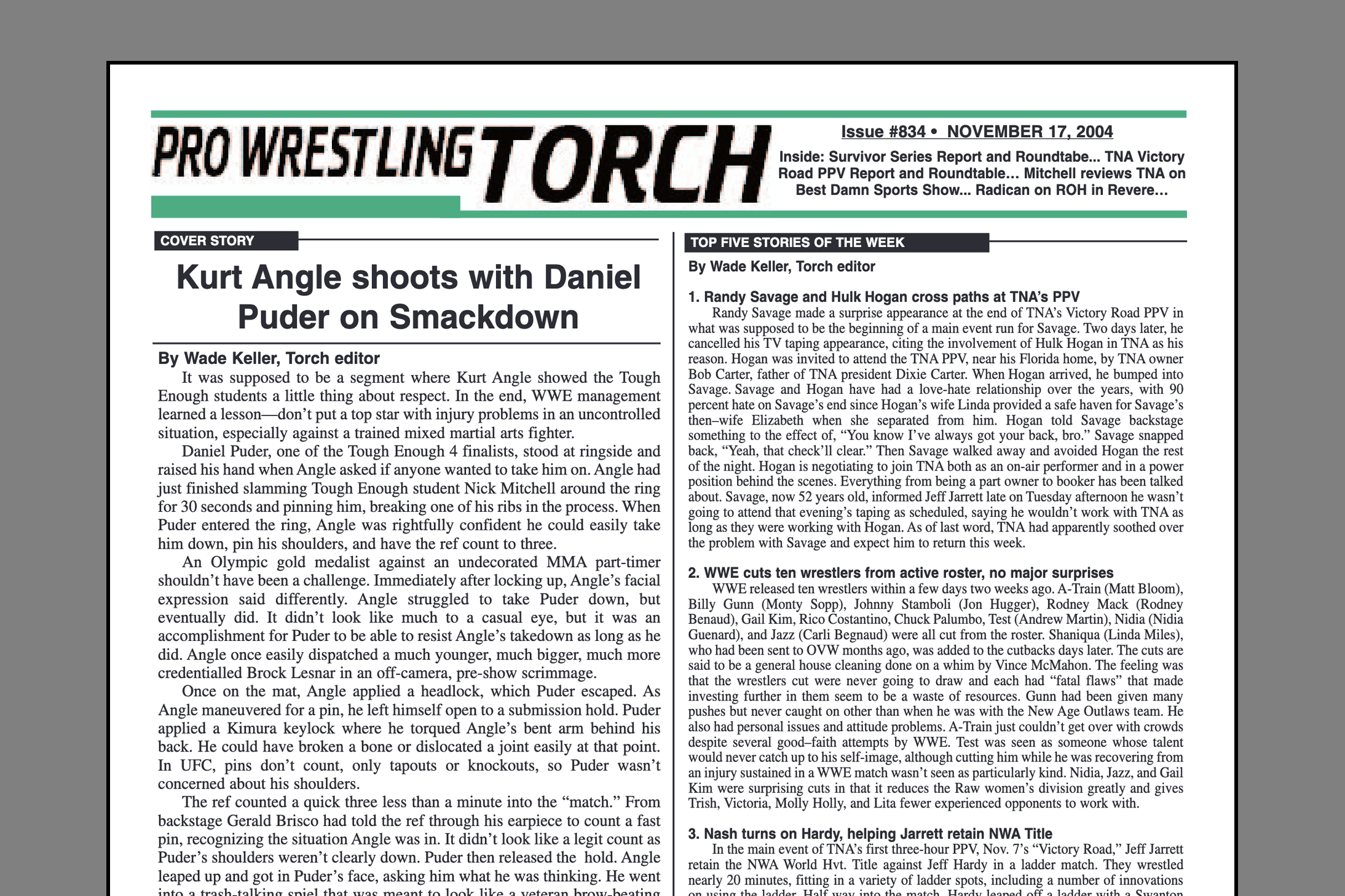 VIP 2004 BACK ISSUE – Pro Wrestling Torch #834 (November 17, 2004): Cover Story on Kurt Angle-Daneil Puder controversy, in-depth WWE Survivor Series and TNA Victory Road coverage, Newswires, TV Reports, Keller’s End Notes, more