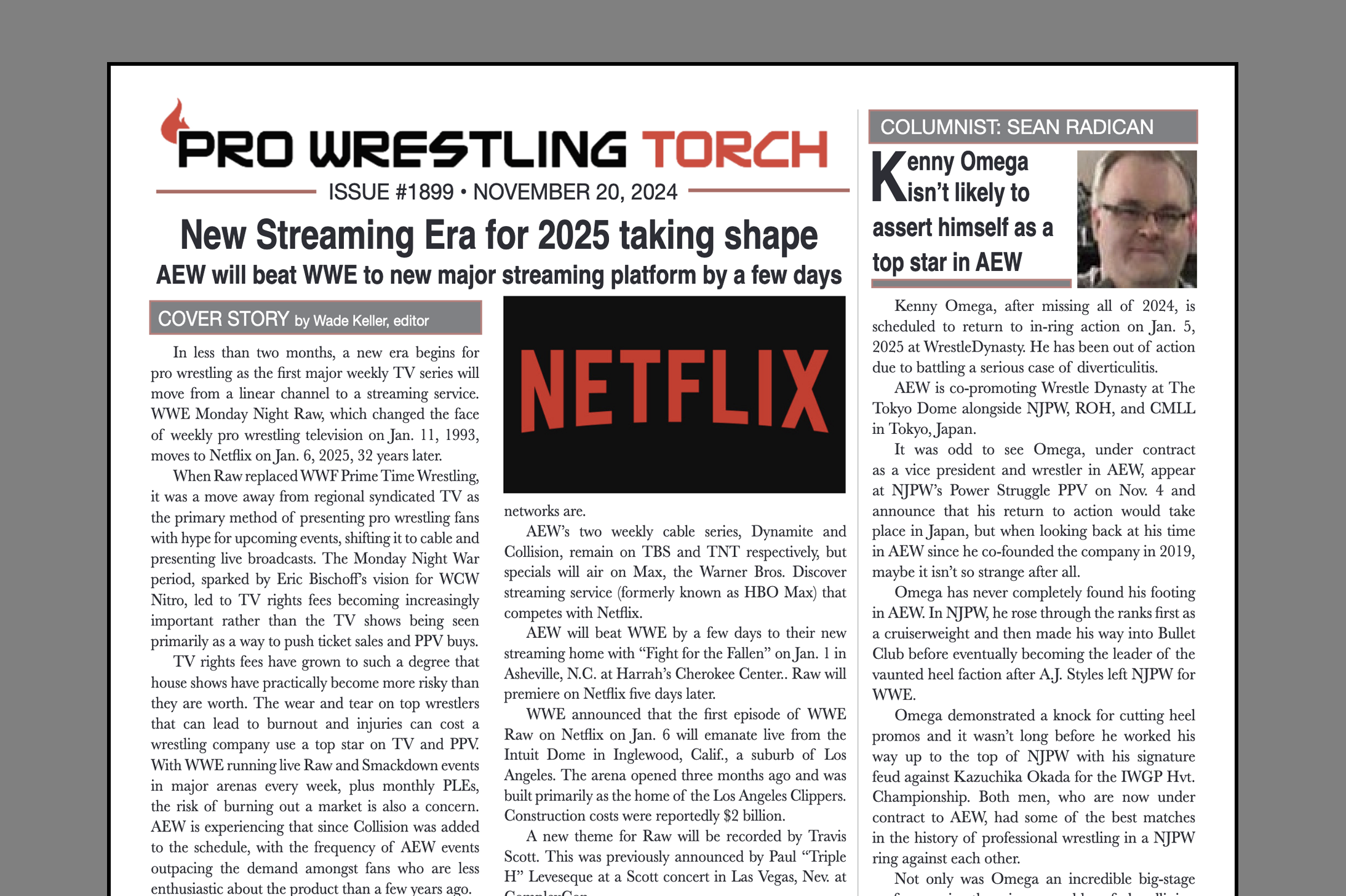SUMMARY: This week’s PWTorch Newsletter features Wade Keller’s Cover Story on streaming shift in 2025… Sean Radican’s feature column on Kenny Omega’s lack of top guy drive… Greg Parks’ feature column on WWE cutbacks… Newswire… Keller’s TV reports… More…
