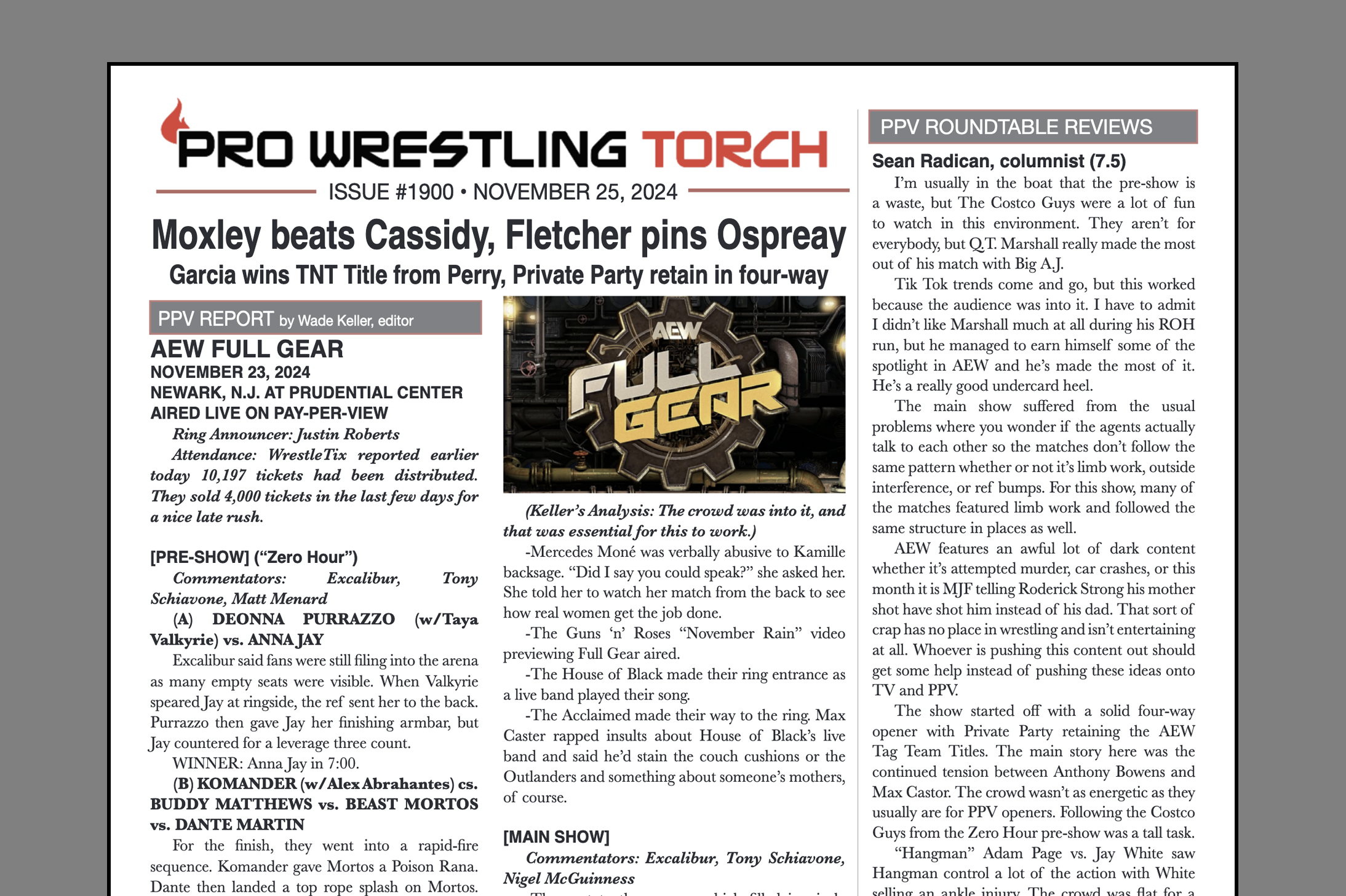 SUMMARY: This week’s PWTorch Newsletter features Wade Keller’s report on AEW Full Gear… AEW Full Gear Roundtable scores and reviews… WWE Crown Jewel Roundtable scores and review… Greg Parks column revisiting the previous WWE Draft… Keller’s TV Reports… More…