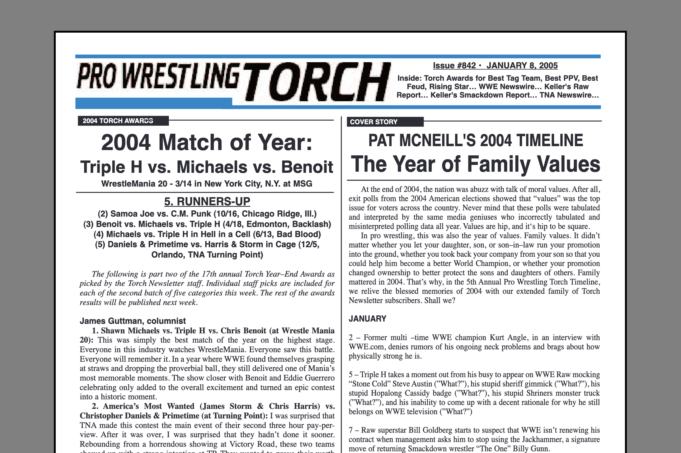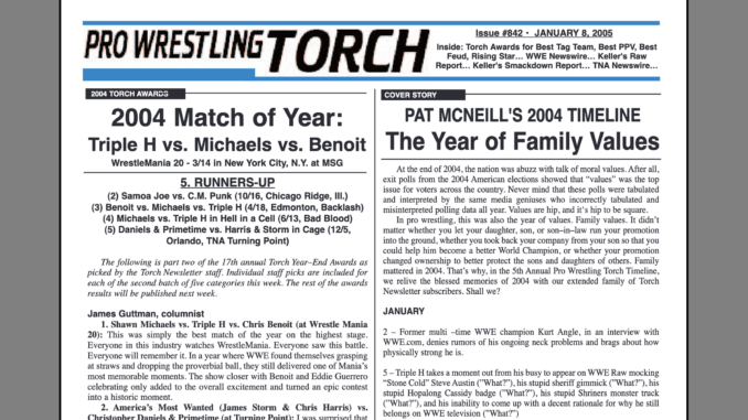 SUMMARY of #842 cover-dated January 8, 2005: This week’s issue includes the second part of the 17th Annual Torch Year-End Awards including Best Match, Best Feud, Best PPV, Rising Star, and Best Tag Team. The winners are announced along with four runners up, plus a list of picks and comments on each category from Bruce Mitchell, Jason Powell, Pat McNeill, James Guttman, and Wade Keller. Also, Pat McNeill’s fifth annual 2004 Timeline titled “The Year of Family Values.” Also, the WWE Newswire, TNA Newswire, Raw’s Big Story, Smackdown’s Big Story, the Weekly Schedule, and more…