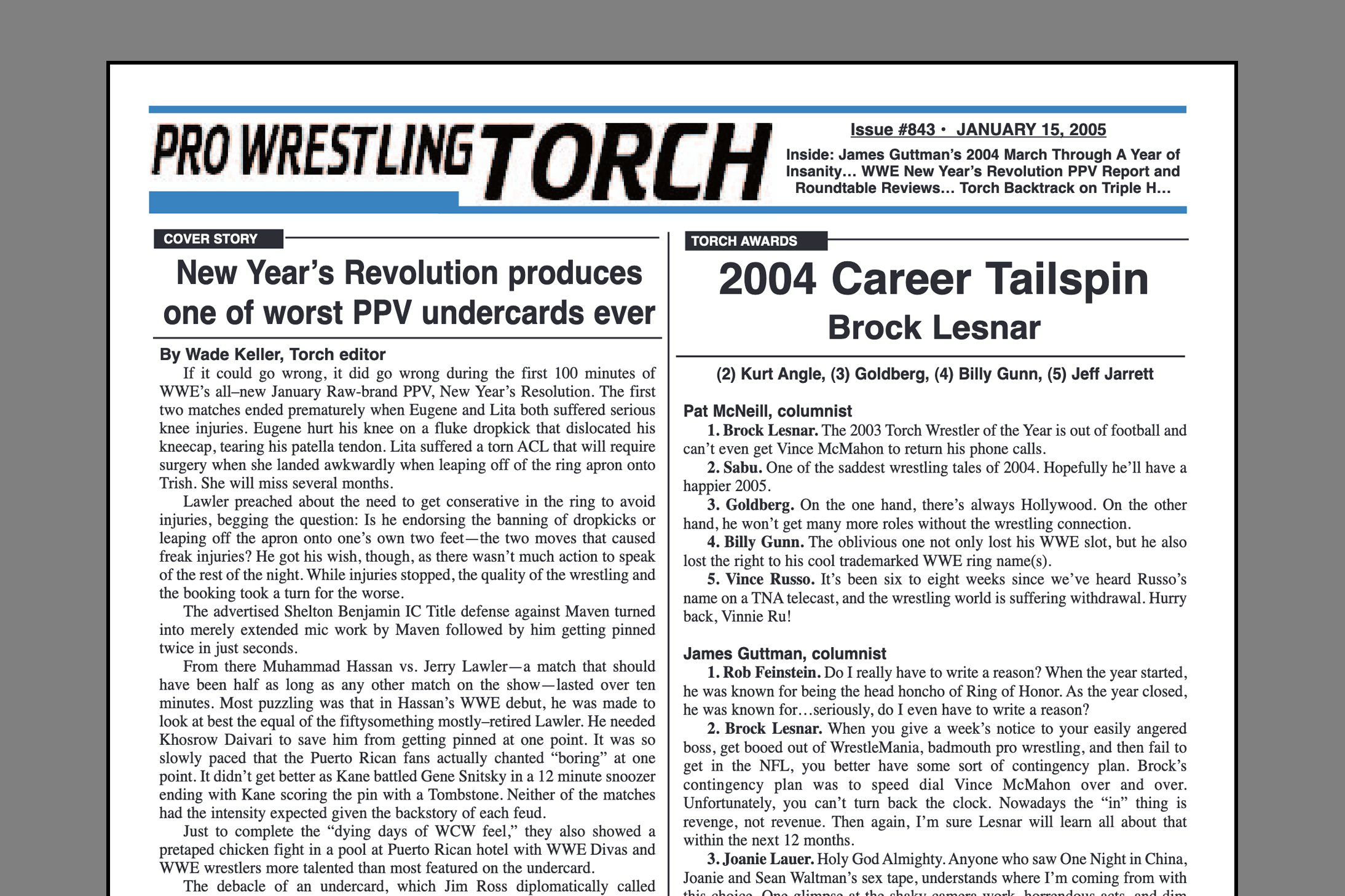 SUMMARY of #843 cover-dated January 15, 2005: This week’s issue includes the third and final part of the 17th Annual Torch Year-End Awards results including Career Tailspin, Best Promos, Worst Promos, Most Underutilized, and Most Overpushed with Torch staff picks for each of the categories and comments on the top picks… A Cover Story on New Year’s Resolution – what went wrong and why and what it means… WWE Newswire with details on the injuries at the PPV, the Shelton-Maven situration, Rock’s movie future, ECW DVD sales, and more… TNA Notebook with details on Abyss’s departure and more… The Big Story on Raw, the Big Story on Smackdown, and the Big Story on TNA Impact… Torch Triple Play with a fascinating 10 year flashback to Triple H’s contract negotiations with WCW and who WCW valued more than him at the time… New Year’s Resolution coverage including Keller’s match report with star ratings, Reader Reax, and Torch staff Roundtable Reviews with Jason Powell, Bruce Mitchell, Pat McNeill, James Guttman, and Wade Keller… End Notes with Wade Keller on WWE’s “ace up their sleeve” regarding the tag team division… And more…