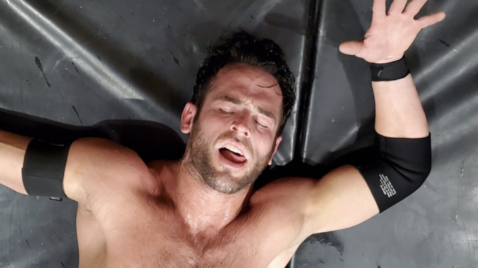 After the break, Riddle tagged in and worked over Gibson for a while. Gibson managed to tag out to Drake, but Riddle met him with a spear. Then he gave an interfering Gibson a Jackhammer. Dunne and Riddle double-teamed Gibson and scored a two count. Gibson took over on Riddle for a while. Dunne broke up a GYV double-team. Riddle gave Drake a dead weight bomb and a Final Flash for a near fall. Riddle gave Drake a fisherman’s buster for another two count. Dunne and Gibson did battle next. Dunne applied an anklelock. Riddle blocked an interfering Drake and applied an anklelock also. The heels powered out and they cut to a break, but stayed with the action on split-screen. [c]