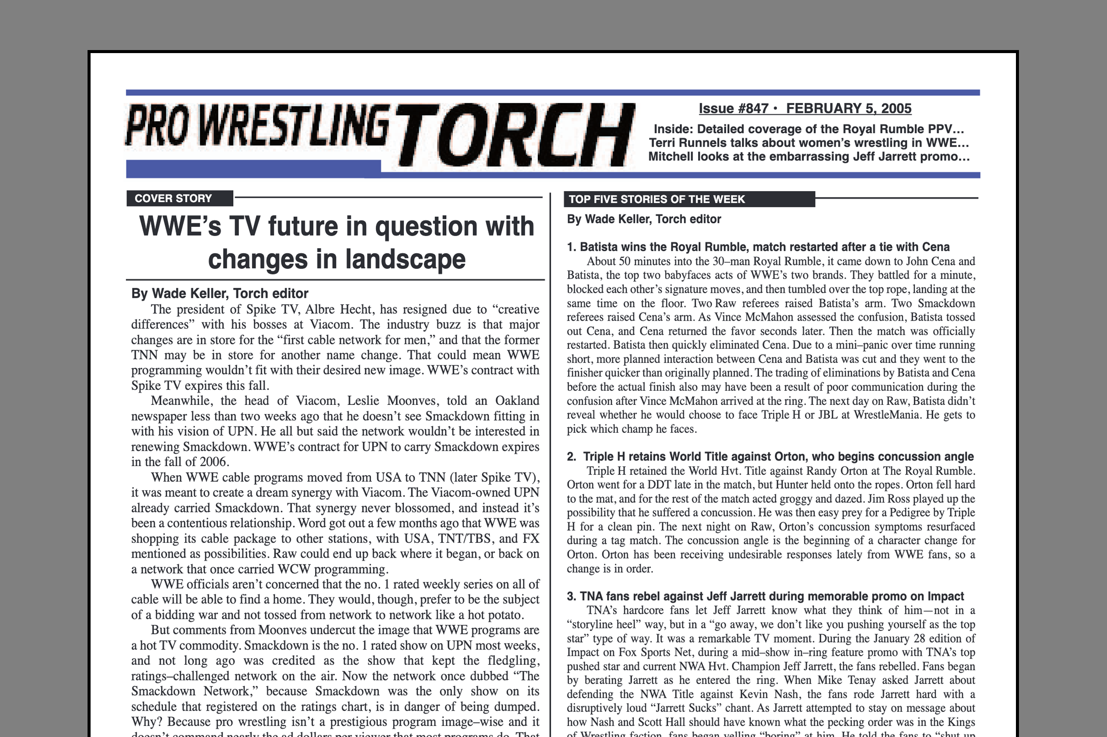 SUMMARY of #847 cover-dated February 5, 2005: The Cover Story features a detailed look at WWE’s television future on cable and broadcast networks… WWE Newswire is loaded with insider backstage news this week including the job progress report on V.P. of Talent Relations John Laurenaitis, criticism of John Cena’s work ethic, how Batista almost lost his job, the latest on Brock Lesnar, reaction within WWE to Puder’s beating at the Rumble and why it happened and what Puder has had to say about his treatment, and much more… Plus TNA Newswire, ROH Newswire, ETC. Newswire… Bruce Mitchell writes about Jeff Jarrett being rejected by TNA’s faithful loudly on national TV… Wade Keller’s End Notes “Random Thoughts”… Royal Rumble coverage including Keller’s match report and star ratings, Roundtable Reviews, and Reader Reax… Backtrack with excerpts of a classic Vince McMahon interview… The Big Stories on Raw, Smackdown, and Impact… Pat McNeill reviews 3PW… Terri Runnels, in part four of her Torch Talk, talks about Trish Stratus, the WWE women’s division, and the time she butted heads with Vince McMahon lost…