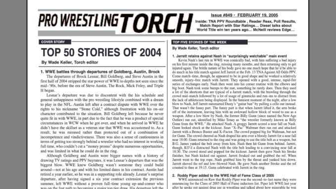 SUMMARY of #849 cover-dated February 19, 2005: This issue is packed with insider news from WWE including exclusive additional details on what went down with Amy Weber that caused her to quit, which top star is in for a mega-mainstream push by WWE and what’s gone wrong so far, the Roddy Piper induction, insider talk about life without Vince McMahon and how his recovery from surgery is coming, the former top star who was interviewed for a new position within WWE, the latest on Kurt Angle’s future, and more… There is also a ton of insider news on TNA including details on what was said backstage before the PPV on Sunday that killed the mood for the wrestlers, a detailed breakdown of what went wrong with the Jeff Hardy-Abyss match and what was supposed to happen, reaction to Scott Hall’s latest problems, what’s up with Billy Gunn and Sean Waltman, reviews for Dusty’s booking so far, why Dusty has heat, who got a promotion behind the scenes, and much more… Also, the annual Top 50 Stories of the Year reviewing 2004’s top 10 stories in detail and listing 11-50, along with the top 10 stories from the past two years… Wade Keller’s editorial on life after WrestleMania for Batista… Pat McNeill’s review of Edge’s autobiography… Bruce Mitchell preview for Sunday’s No Way Out… Detailed coverage of TNA’s PPV with Keller’s match reviews and star ratings, roundtable reviews and scores, and reader reax with poll results… The Big Story on Raw, The Big Story on Smackdown, The Big Story on TNA Impact… The Top Five Stories of the Week… A Backtrack to Diesel’s first media interview shortly after winning the WWF Title ten years ago… And more…
