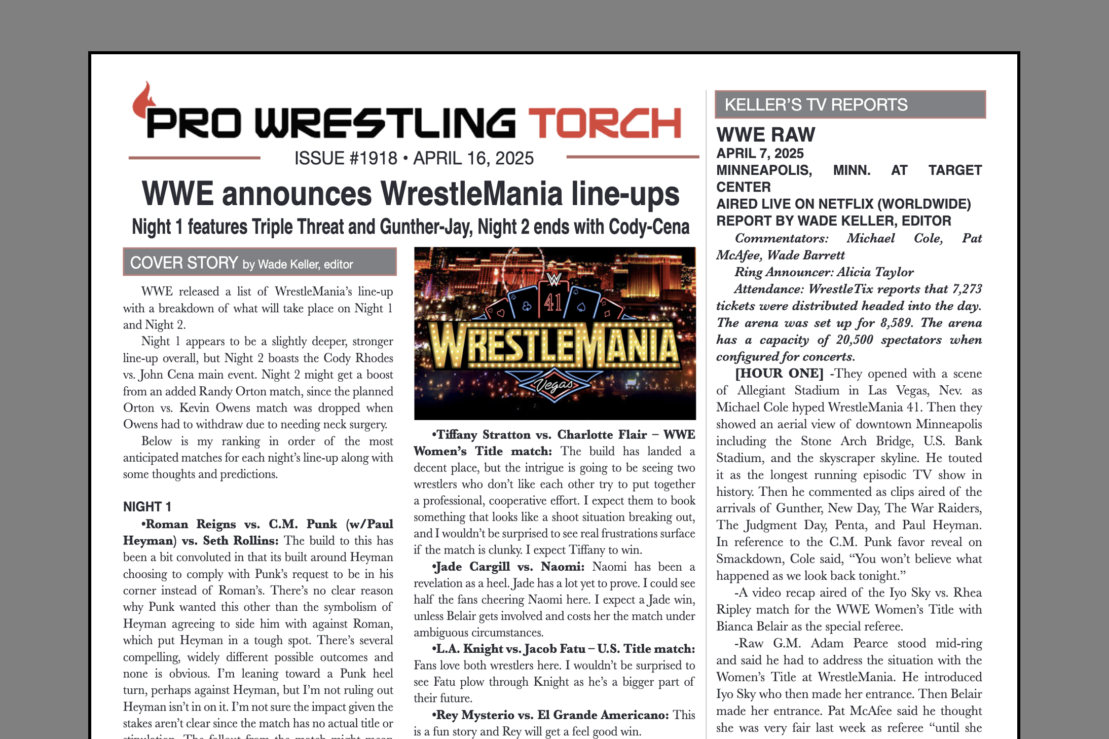 SUMMARY: This week’s PWTorch Newsletter features Wade Keller’s cover story on the full announced WrestleMania line-up with some predictions… Two columns from Greg Parks including one on the WWE Network’s legacy and another with Greg revisiting his post-Royal Rumble predictions on what the WrestleMania line-up would be… Wade Keller’s TV reviews… More…