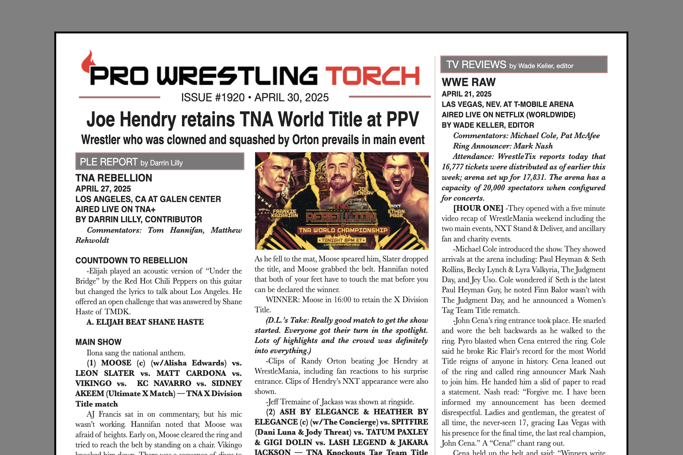 SUMMARY: This week’s PWTorch Newsletter features Darrin Lilly’s TNA Rebellion PPV report… Keller’s TV reports including the Raw After Mania and Smackdown After Mania…