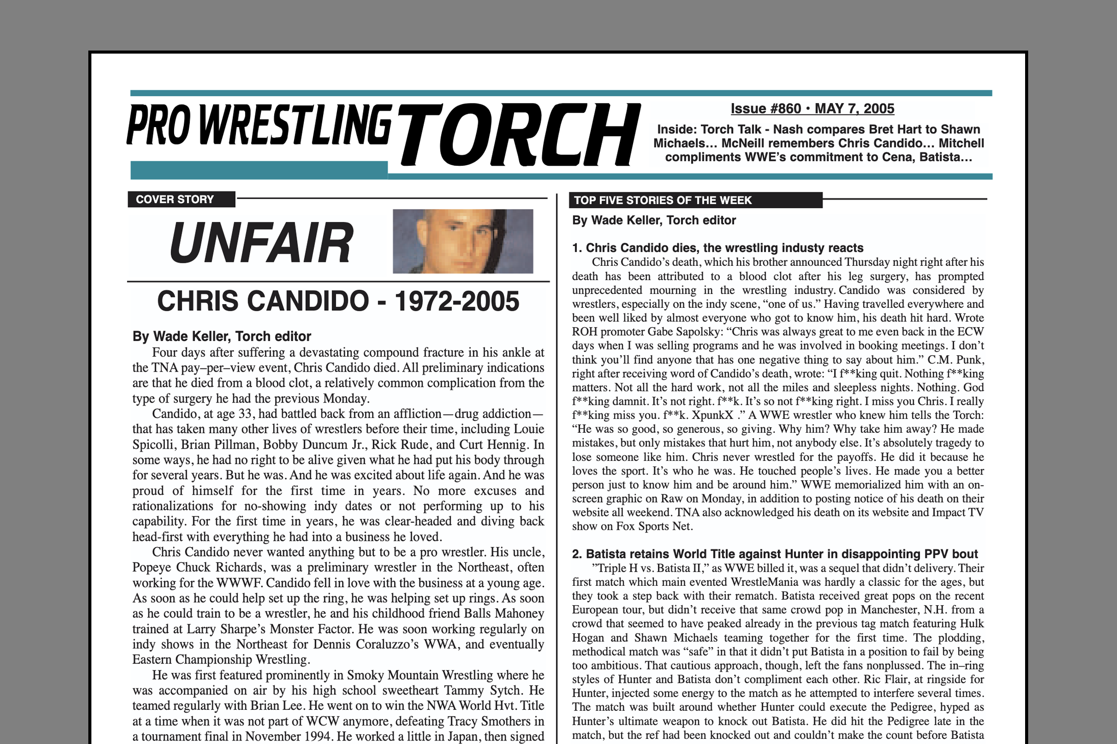 SUMMARY of #860 cover-dated May 7, 2005: This issue features a Cover Story on Chris Candido’s life and death, Pat McNeill’s “In Their Words” tribute to Candido, and Wade Keller’s “End Notes” chastising Phil Mushnick for inappropriate usage of Candido’s death to prompt his latest editorial on the New York Post… The Top Five Stories of the Week including WWE’s successful European tour, Batista’s win over Triple H at Backlash, Hulk Hogan’s return, and Monty Brown’s contract impasse with TNA… Bruce Mitchell writes about the daring pushes of John Cena and Batista… Part five of the “Torch Talk” with Kevin Nash who compares Shawn Michaels to Bret Hart and gives his take on the Bret Hart Survivor Series Swerve… WWE Newswire with Hogan’s media tour, Brock Lesnar countersuit highlights, the latest on the ECW PPV, and much more… TNA Newswire, ROH Newswire, and ETC. Newswire… Derek Burgan’s May Torch Buyer’s Guide with reviews of the latest DVD and book reviews… Backtrack with Sabu’s response to criticism by his colleagues in the Torch… Complete Backlash coverage with Keller’s Match Report with star ratings, Roundtable Reviews, and Reader Reax… Jason Powell’s “On Topic” (online version only) with a scenario to introduce Matt Hardy and utilize Jonny Fairplay in TNA this summer…. The Big Stories on Raw, Smackdown, and TNA Impact… And more…