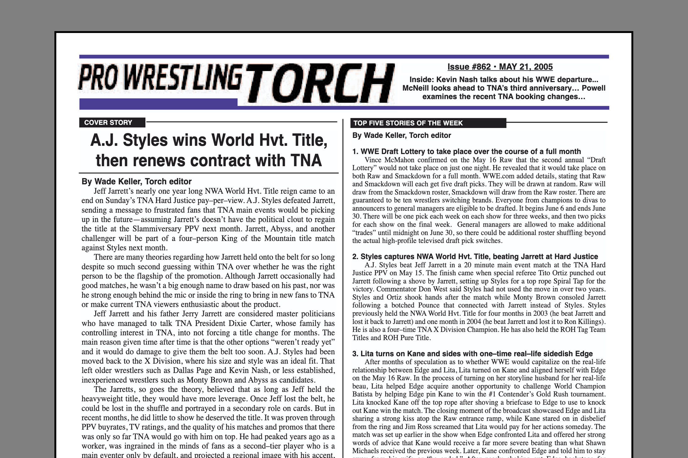 SUMMARY of #862 cover-dated May 21, 2005: This issue features a Cover Story on A.J. Styles ending Jeff Jarrett’s NWA Title reign and analysis of the politics that led to it… Part seven of the Kevin Nash “Torch Talk” focuses on Triple H, the trouble he got in for participating in the MSG Farewell, and why he thinks he’s the best wrestler today… Pat McNeill looks ahead to TNA’s anniversary PPV… Jason Powell analyzes the new TNA booking committee… Bruce Mitchell explains all of Vince McMahon’s hidden messages on Raw this week… Wade Keller previews Judgment Day and discusses the lost opportunity for WWE when they do hardcore angles such as rape… In-depth coverage of TNA Hard Justice including Keller’s Match Report with star ratings, Torch Roundtable Reviews, and Reader Reax… Backtrack looks at the steroid controversy in pro wrestling in 1995… Plus WWE Newswire, TNA Newswire, ROH Newswire, OVW Newswire, The Big Stories on Raw, Smackdown, and TNA Impact, and more…