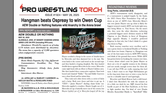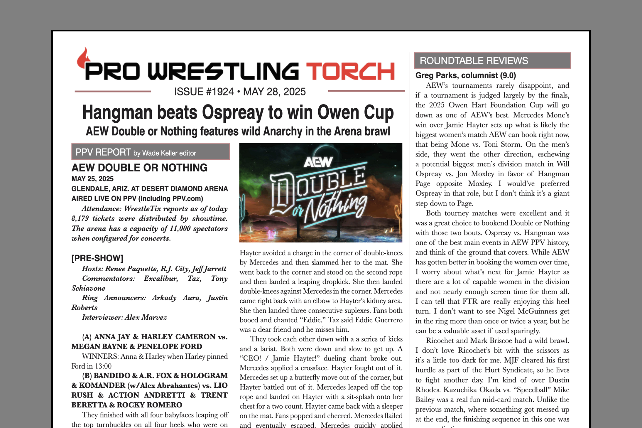 SUMMARY: This week’s PWTorch Newsletter features Wade Keller’s report on AEW Double or Nothing plus the PPV Staff Roundtable Reviews and Scores… Keller’s TV Reports… WWE Saturday Night’s Main Event special report… Greg Parks feature column on the best matches of WrestleMania Weekend that he watched… And more…