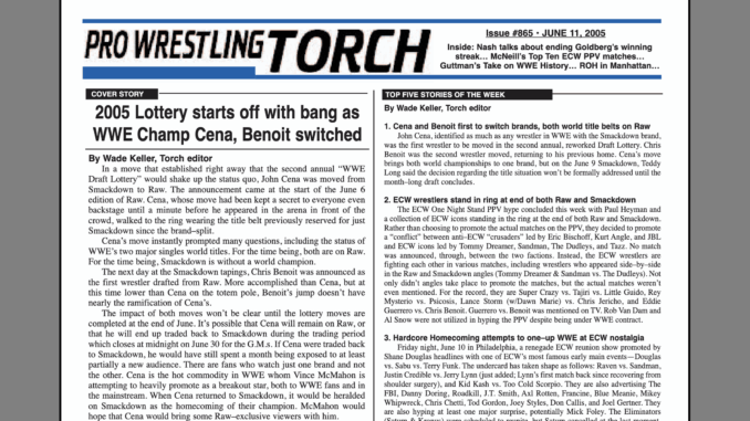 SUMMARY of #865 cover-dated June 12, 2005: The cover story features a look at the first week of the second annual Draft Lottery… The Top Five Stories of the Week… WWE Newswire, TNA Newswire, ROH Newswire, OVW Newswire… James Guttman’s look at the WWE-ECW history revision… Pat McNeill’s list of the Top Ten ECW PPV Moments… The latest ROH video release, Manhattan Mayhem, reviews with Keller’s star ratings and Roundtable Reviews from Keller, Bruce Mitchell, Jason Powell, and Derek Burgan… Wade Keller’s End Notes asks if you’re confused yet by WWE’s latest TV shows… Backtrack looks at a crossroads for ECW and Heyman’s PPV aspirations… Backtrack also compares the WWF and WCW rosters ten years ago… ROH Live Event Report from Buffalo, N.Y… The Big Story on Raw… The Big Story on Smackdown… OVW TV Review… Part ten of the Kevin Nash “Torch Talk” with his take on ending Goldberg’s winning streak, his idea for Chris Jericho, and more…