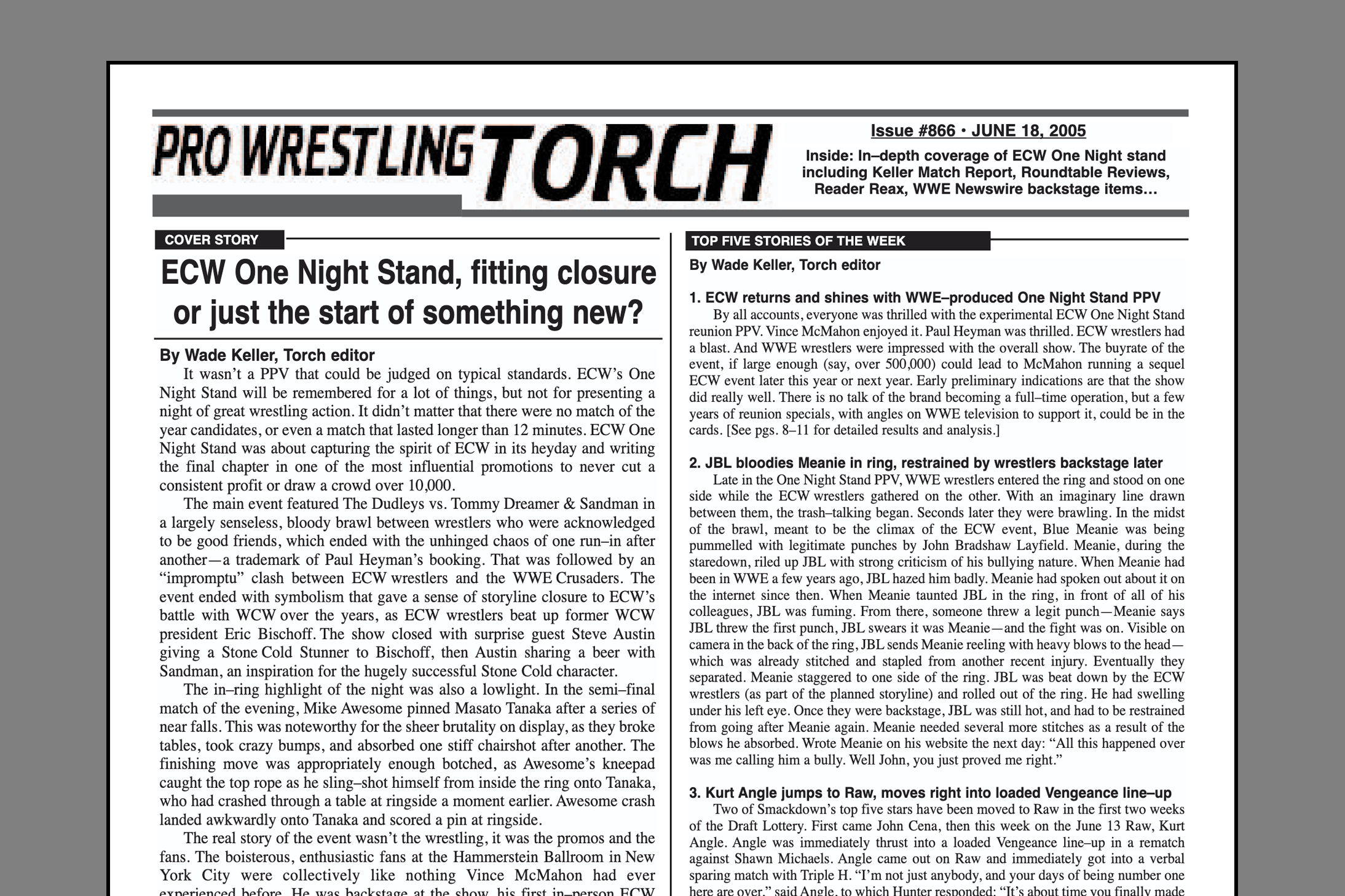 SUMMARY of #866 cover-dated June 19, 2005: This issue features a special ECW Newswire packed with tons and tons of insider details on the One Night Stand PPV… In-depth coverage of the ECW One Night Stand PPV including Keller’s Match Rundown, Roundtable Reviews from the entire Torch staff, expanded Reader Reax, and a Cover Story… Plus the Top Five Stories of the Week, WWE Newswire, The Big Story on Raw, The Big Story on Smackdown, OVW TV Report, Hardcore Homecoming Report, a feature column by Pat McNeill comparing ROH in Manhattan to ECW One Night Stand, End Notes with Wade Keller on this week’s Raw, and more…