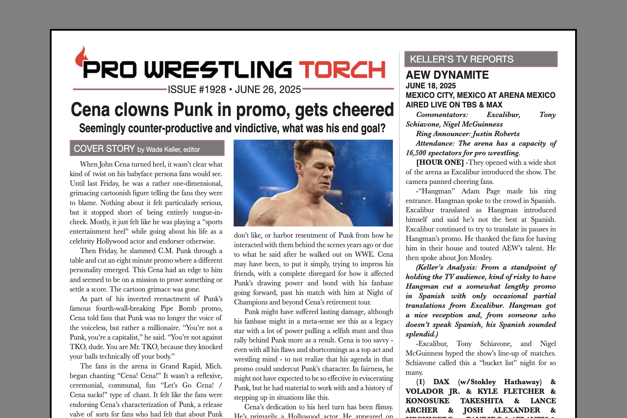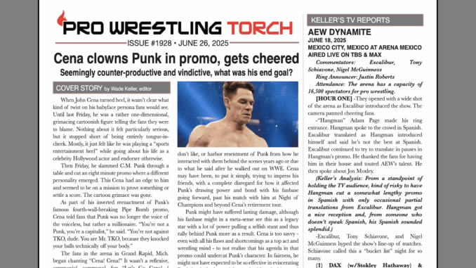 SUMMARY: This week’s PWTorch Newsletter features Wade Keller’s cover story on John Cena clowning C.M. Punk on Smackdown… Greg Parks column assessing what he missed on vacation… Keller’s TV reports… Torch Newswire… More…