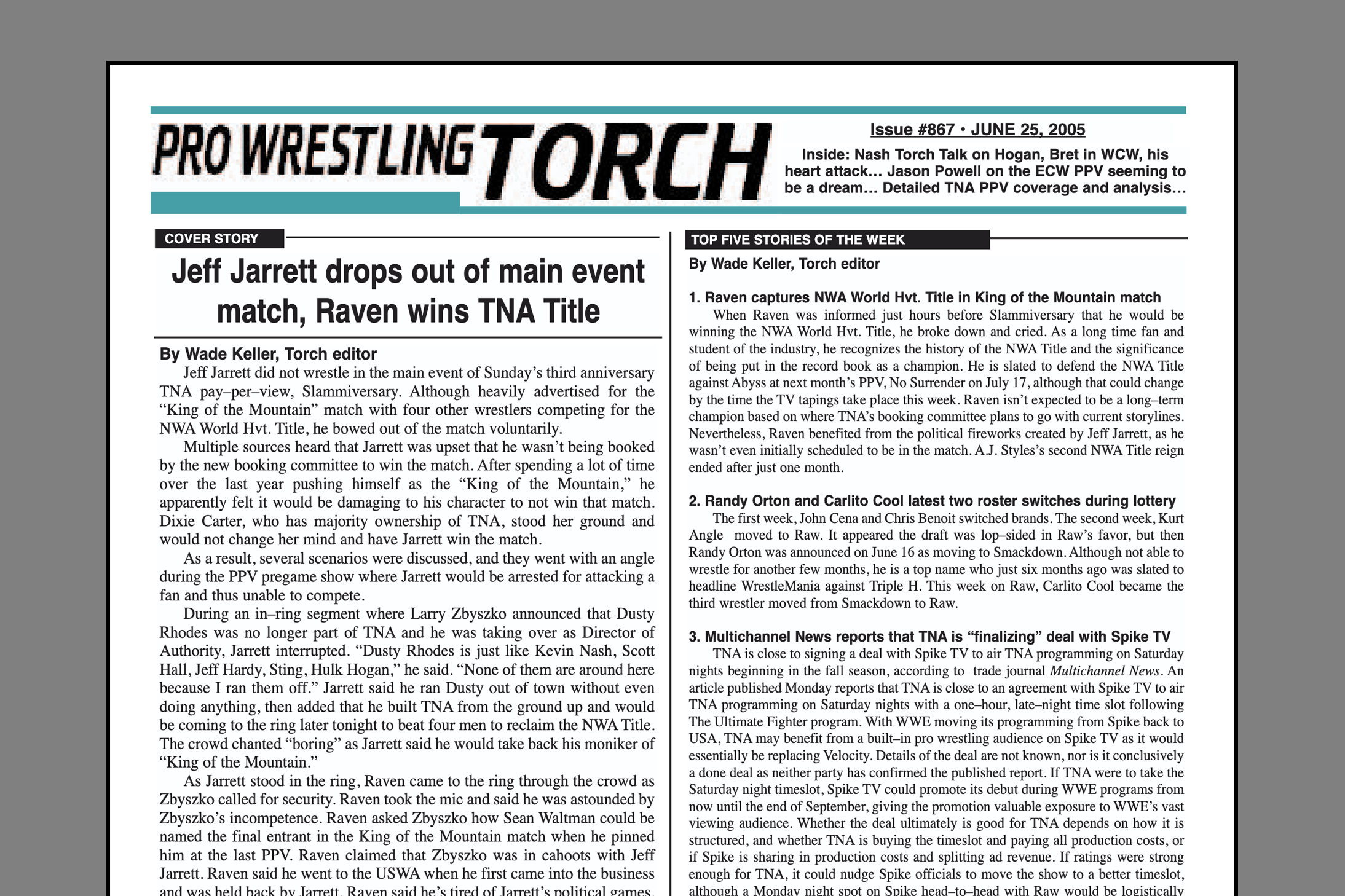 SUMMARY of #867 cover-dated June 26, 2005: This issue features the eleventh installment of the Kevin Nash “Torch Talk” series where he talks about whether Hulk Hogan’s self-preservationist practices contributed greatly to killing WCW, the shame in how Bret Hart was utilized, and his frustrations as WCW booker… The Cover Story looks at the series of events that led to Raven becoming NWA World Hvt. Champion and Jeff Jarrett dropping off the show… Feature columns from Pat McNeill and Jason Powell… WWE Newswire with more on the Blue Meanie-JBL incident, the secrecy of the draft lottery, and more… Plus TNA Newswire, ROH Newswire, and OVW Newswire… The Big Stories on Raw, Smackdown, and OVW TV… Backtrack featuring Paul Heyman telling the Torch ECW is not ready for PPV… ROH in Manhattan… Detailed coverage of TNA Slammiversary including Keller’s Match Report with star ratings, Roundtable Reviews, and Reader Reax… Wade Keller’s End Notes with random thoughts on the week… And more…