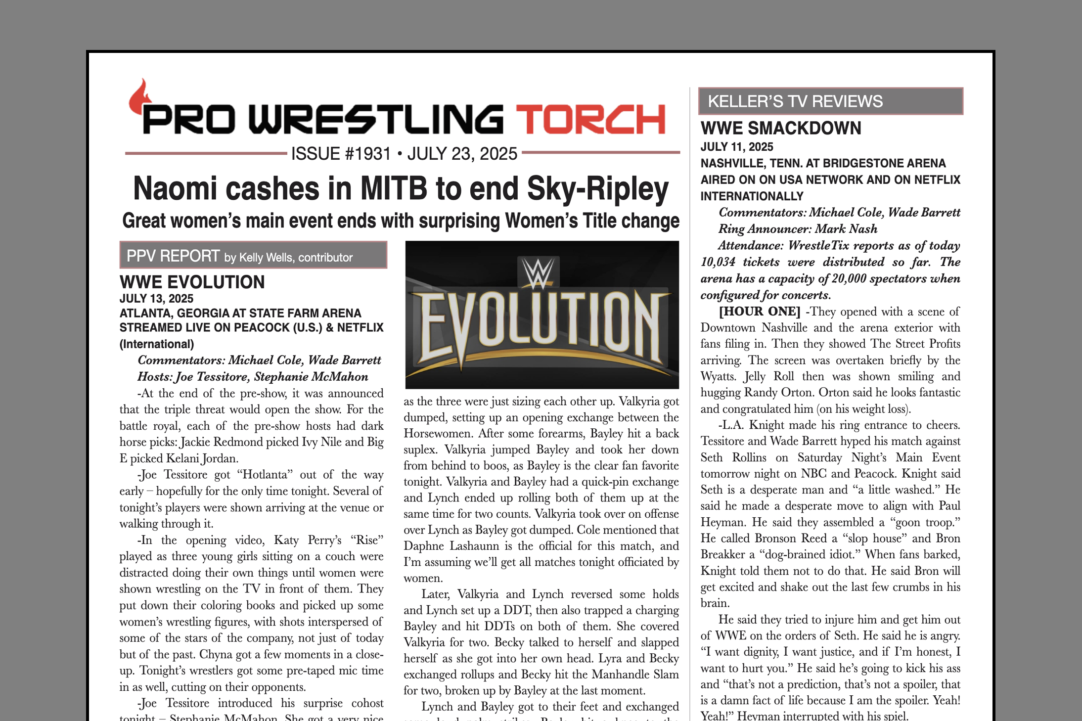 SUMMARY: This week’s PWTorch Newsletter features Greg Parks looking at the top matches on packed weekend… Reports on Evolution, Saturday Night’s Main Event, Raw, Smackdown, Dynamite… More…