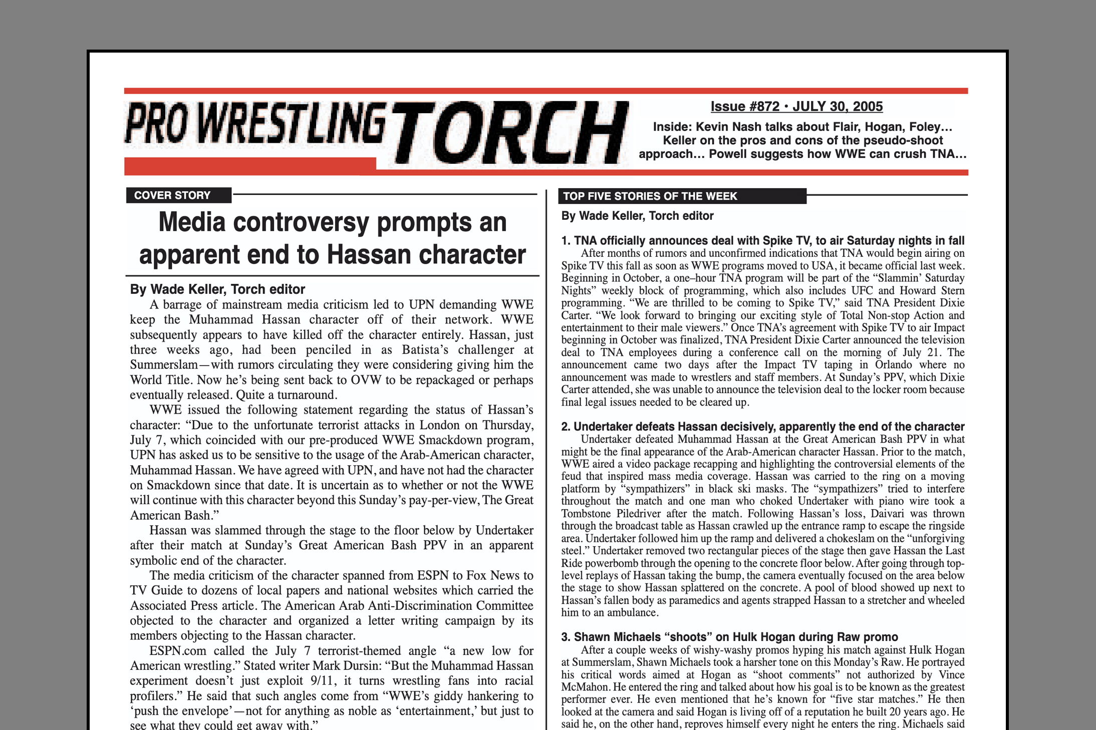 SUMMARY of #872 cover-dated July 30, 2005: The cover story presents an overview of the media barrage that led to the end of the Muhammad Hassan character… Detailed Great American Bash coverage including Keller’s match report with star ratings, Roundtable Reviews from the Torch staff, and reader reax… Jason Powell’s feature column looks at how WWE can crush TNA out of the gate… Pat McNeill looks at a recent IWA Mid-South DVD release… Bruce Mitchell’s Memo presents ideas for WWE.com… Kevin Nash’s Torch Talk, installment no. 15, includes his thoughts on Hulk Hogan, Ric Flair, Clique power, Mick Foley, and more… Plus WWE Newswire, TNA Newswire, OVW Newswire, Top Five Stories of the Week, The Raw Big Story, The Smackdown Big Story, The OVW Big Story, The TNA Impact Big Story, End Notes with Wade Keller, and more…