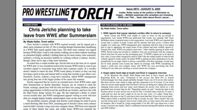 SUMMARY of #873 cover-dated August 6, 2005: The cover story looks at Chris Jericho’s future in pro wrestling now that he’s finishing up with WWE after Summerslam… Part 16 (out of 17) with Kevin Nash features his thoughts on Goldberg’s run, Lesnar’s decision to leave WWE, Jim Ross, Jeff Jarrett, Sid, Randy Savage, Curt Hennig, and more… Wade Keller’s expanded feature editorial looks at the behind the scenes dynamic going on between Shawn Michaels and Hulk Hogan, with a forecast of what could happen at Summerslam and how it is similar to and different than the Hulk Hogan-Rock dynamic… Pat McNeill examines why wrestlers are choosing to sign with WWE almost at a 100 percent rate compared to other reasonable options… Gabe Sapolsky tells the Torch why he’s changed his booking approach recently… Plus WWE Newswire, TNA Newswire, OVW Newswire, ETC. Newswire, ROH Newswire, Top Five Stories of the Week, The Raw Big Story, The Smackdown Big Story, The OVW Big Story, The TNA Impact Big Story, End Notes with Wade Keller, and more…
