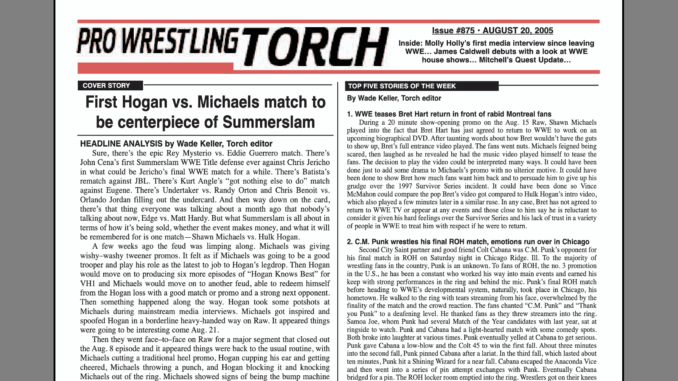 SUMMARY of #875 cover-dated August 20, 2005: The cover story looks at the final hype for the Shawn Michaels vs. Hulk Hogan match and the potential directions the match could go based on backstage happenings so far… Part one of the Nora “Molly Holly” Greenwald “Torch Talk” with her thoughts on how women are portrayed in WWE… “The Perspective with James Caldwell” premieres with analysis of one major area of WWE’s business that isn’t reaching its potential… Mitchell’s Memo features the results of Bruce Mitchell’s Quest to find a Jeff Jarrett fan… In-depth coverage of TNA’s Sacrifice PPV including Keller’s Match Report with star ratings, Roundtable Reviews, and Reader Reax… Plus WWE Newswire, TNA Newswire, ROH Newswire, Top Five Stories of the Week, The Raw Big Story, The Smackdown Big Story, The OVW Big Story, The TNA Impact Big Story, Backtrack, ROH Live Event Report, and more…