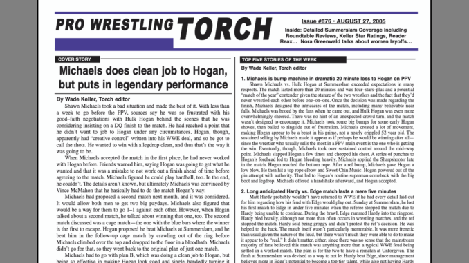 SUMMARY of #876 cover-dated August 27, 2005: The cover story presents details of the negotiations between Shawn Michaels and Hulk Hogan regarding how their match would go on Sunday at Summerslam and the reason the proposed rematch didn’t take place, plus more fascinating details… WWE Newswire details reaction within WWE to the Michaels-Hogan match (and Summerslam in general) including why Michaels chose to the take the route he did, what choices he did and didn’t have, and who influenced his decisions. Also, details on Matt Hardy’s push and why management isn’t getting more behind him, plus lots more backstage news… In-depth Summerslam Coverage including Keller’s Match Report with star ratings, Roundtable Reviews including the entire Torch staff, Reader Reax, and Poll Results… Part two of the Nora Greenwald (Molly Holly) “Torch Talk” interview with her thoughts on the demise of the women’s division in WWE, her shoot fight with Dean Malenko that led to an injury, and whether her Christianity affected her push in WWE… 10 Yrs. Ago Backtrack features looking at why Rick Steamboat left the WWF shortly after WrestleMania 3 in his own words, insider details on Jeff Jarrett and Roadie quitting the WWF without notice, and a story of a wrestler getting fired due to his girlfriend getting into a fight with another wrestler’s girlfriend… Wade Keller’s End Notes reviews the Hogan-Michaels match and puts it in historical perspective… Details on TNA’s Spike TV deal and the contracts its offering wrestlers right now… Plus ROH Newswire, Top Five Stories of the Week, The Raw Big Story, The Smackdown Big Story, The OVW Big Story, The TNA Impact Big Story, ROH Live Event Report, and more…