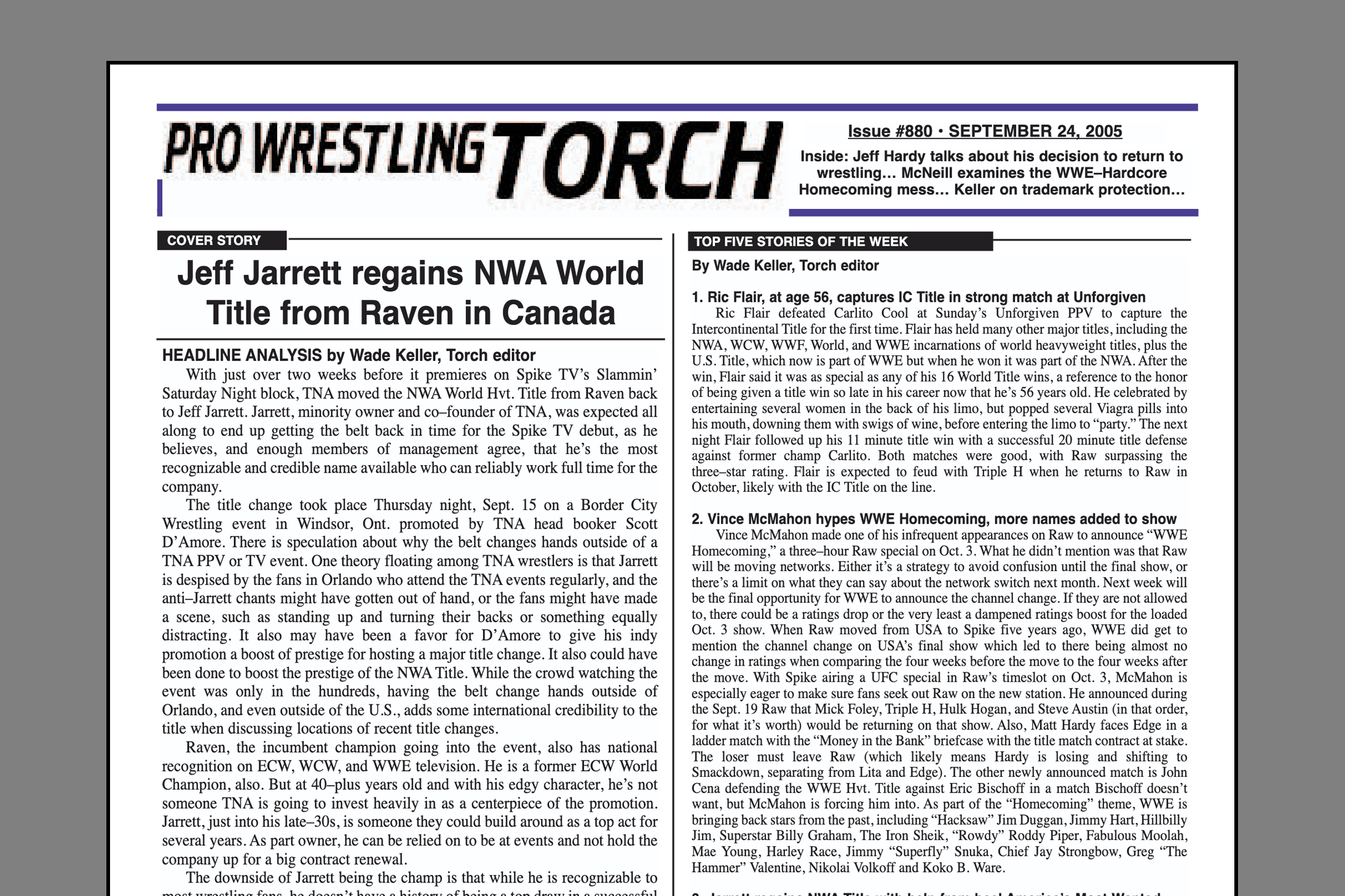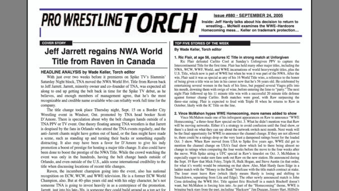 SUMMARY of #880 cover-dated September 24, 2005: The cover story looks at TNA’s decision to give the NWA World Title belt back to Jeff Jarrett just before the Spike TV debut… Promoter Gabe Sapolsky tells the Torch about the ROH World Title change and the departure of Mick Foley in the ROH Newswire… Pat McNeill, Bruce Mitchell, and Wade Keller each tackle the issue of WWE’s aggressive protection of their trademarks as it relates to Hardcore Homecoming with in-depth analysis, sarcasm, and historical perspective mixed in… Part one of the Jeff Hardy “Torch Talk” feature Jeff’s most in-depth discussion yet about the Lita-Edge controversy including his regrets over how he handled the situation himself, who he wants to apologize to, why he sees more than one side to the story, and details of his relationship with his brother these days, plus his hopes and dreams for TNA now that the Spike TV debut is near, and more. It’s a great follow-up on the Ultimate Insiders DVD interview with Jeff… In-depth coverage of WWE Unforgiven including columnist Roundtable Reviews… Also WWE Newswire with inside news, TNA Newswire, Top Five Stories of the Week, The Raw Big Story, The Smackdown Big Story, The OVW TV Big Story, Backtrack on Lex Luger’s surprise jump to WCW, Arena Spotlight, and more…