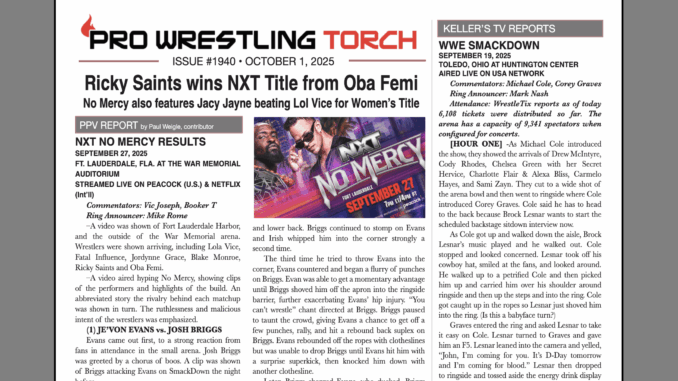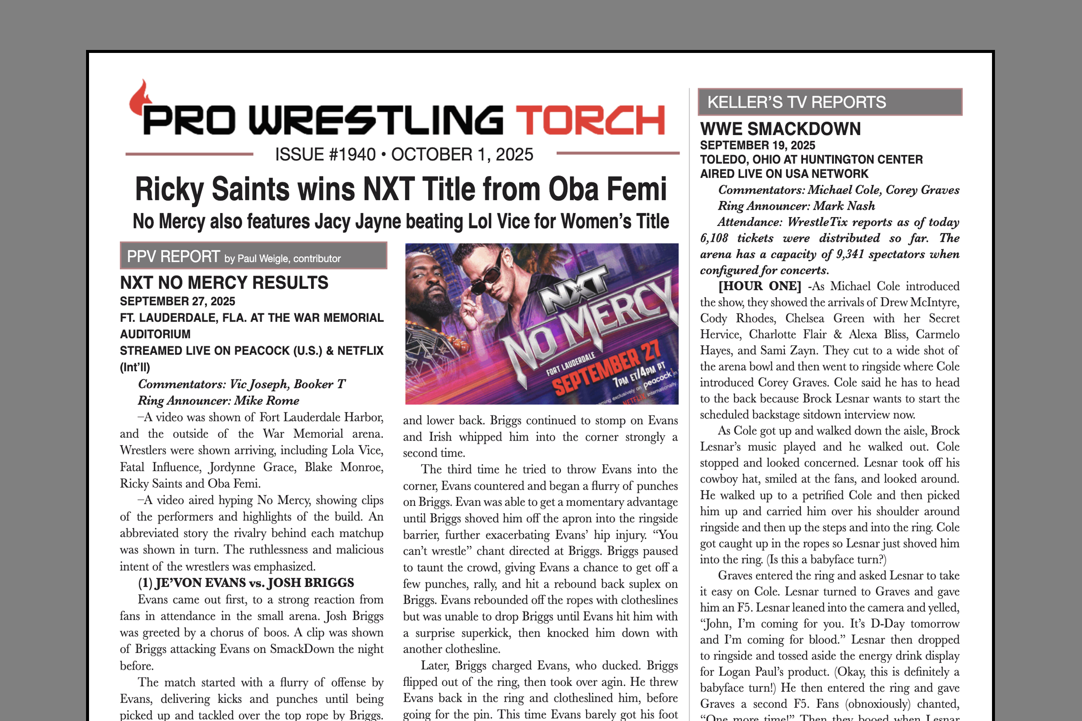 SUMMARY: This week’s PWTorch Newsletter features coverage of NXT No Mercy featuring Ricky Saints winning the NXT Title from Oba Femi… Greg Parks looks at Chris Jericho’s future… PPV Roundtable Reviews of WWE WrestlePalooza… Keller’s TV Reports… Torch Newswire… More…