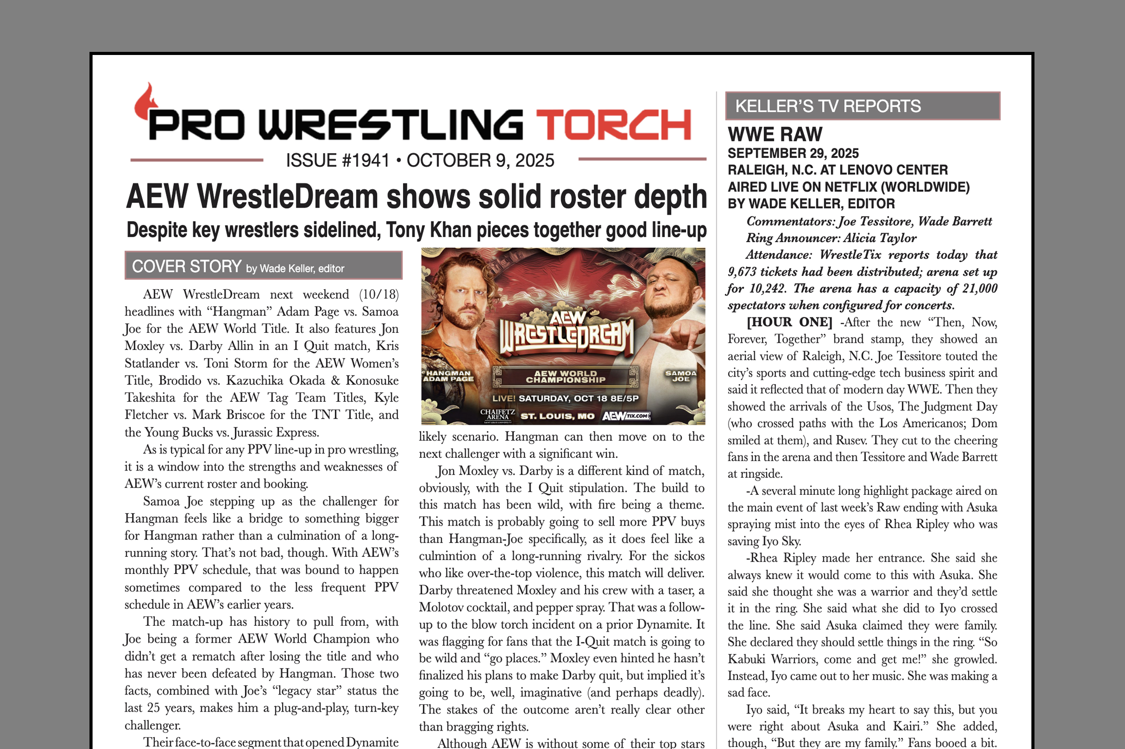 VIP NEWSLETTER – PRO WRESTLING TORCH #1941 (Oct. 9, 2025): Keller’s AEW WrestleDream preview, Parks column on Don Callis Family, Keller’s TV reports