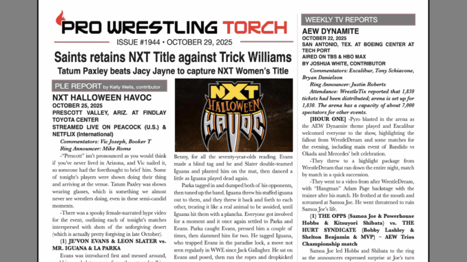 SUMMARY: This week’s PWTorch Newsletter features a NXT Halloween Havoc… Keller’s End Notes on Samoa Joe’s disappointing promo after his turn… Keller’s TV reports… Greg Parks’s column on WWE under-the-radar developmental roster cuts… Torch Newswire… More…