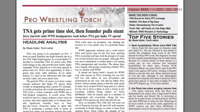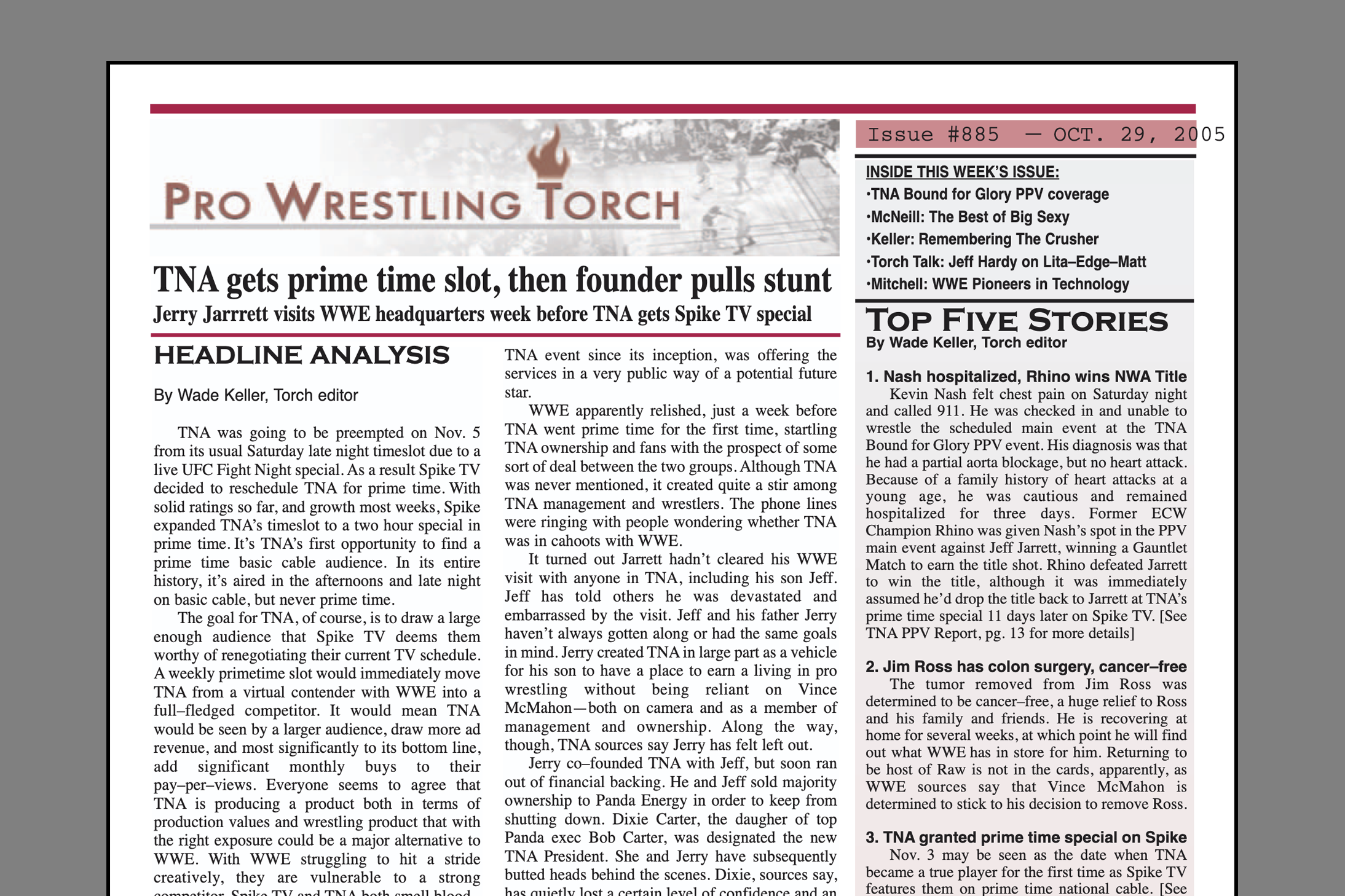 SUMMARY of #885 cover-dated October 29, 2005: The cover story features Wade Keller’s in-depth look at TNA’s next big step to prime time and Jerry Jarrett’s distraction last week by visiting WWE headquarters… Pat McNeill looks at the top moments of Kevin Nash’s career… Wade Keller writes a feature article on how Crusher changed how he looked at pro wrestling… Wade Keller also writes about the Steve Austin-Coach debacle and the misuse of WWE Legends… Bruce Mitchell writes about WWE’s latest attempt to be a pioneer of technology… Detailed analysis of the TNA Bound for Glory PPV… Torch Talk with Jeff Hardy, part five, features his most controversial comments yet regarding the Matt Hardy-Lita-Edge situation…. Plus WWE Newswire with details on Christian’s departure, TNA Newswire, ETC. Newswire, The Top Five Stories of the Week, 1995 Backtrack, Live Event Report, and more…
