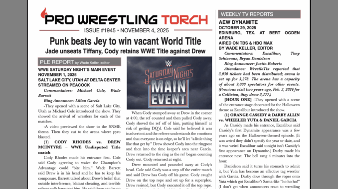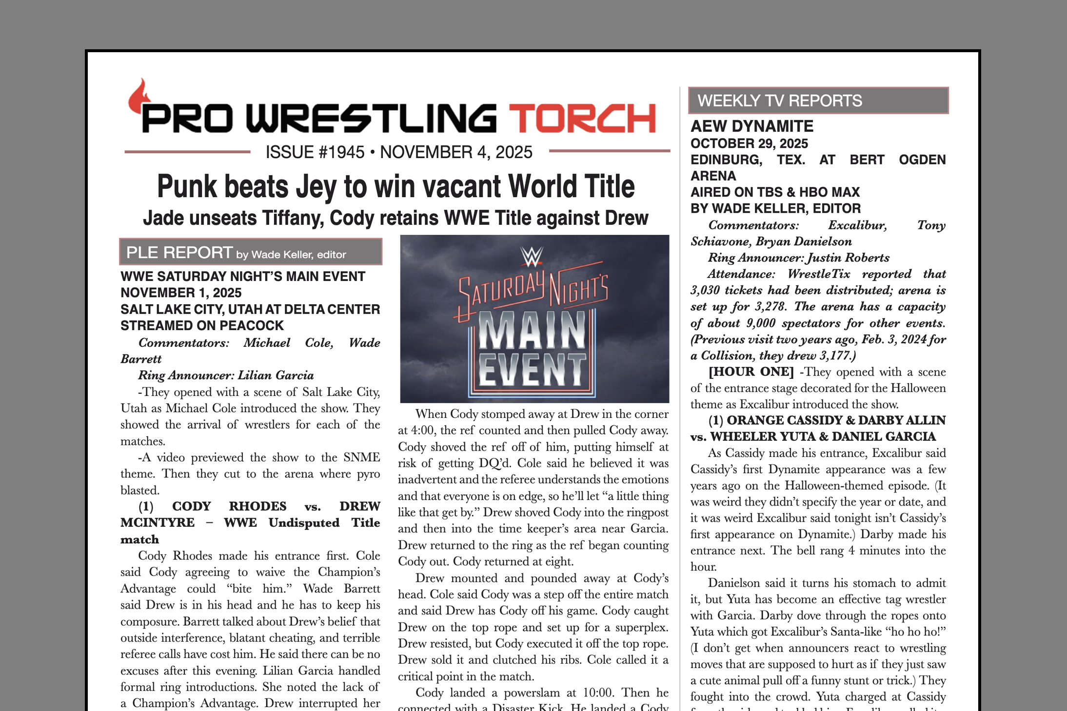 SUMMARY: This week’s PWTorch Newsletter features Wade Keller’s report on WWE Saturday Night’s Main Event… Keller’s End Notes looking at the month of November’s big happenings, an aging WWE main event male roster, and more… Keller’s TV reports… Greg Parks’s column on the potential end point for the Mercedes Mone belt collecting… Torch Newswire… More…