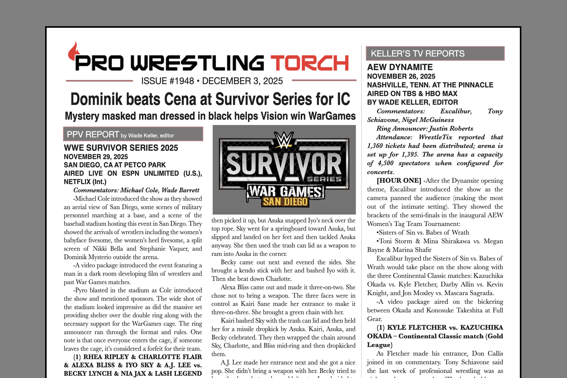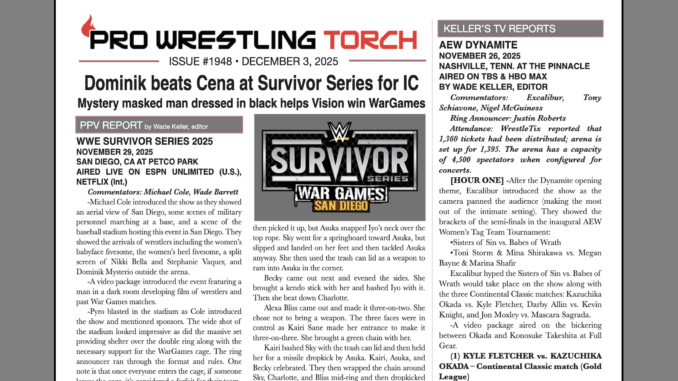 SUMMARY: This week’s PWTorch Newsletter features Wade Keller’s report on AEW Full Gear… Greg Parks feature column looks at the crop of reported soon-to-be free agents and where they might land… Wade Keller’s End Notes on the C.M. Punk vs. Bron Breakker match next month on Netflix and the possibilities in the AEW Continental Classic… Keller’s TV reports… Torch Newswire including the big news of TNA signing a three-year TV rights deal with AMC which doubles their potential audience… PPV Roundtable Reviews of AEW Full Gear and WWE Survivor Series…