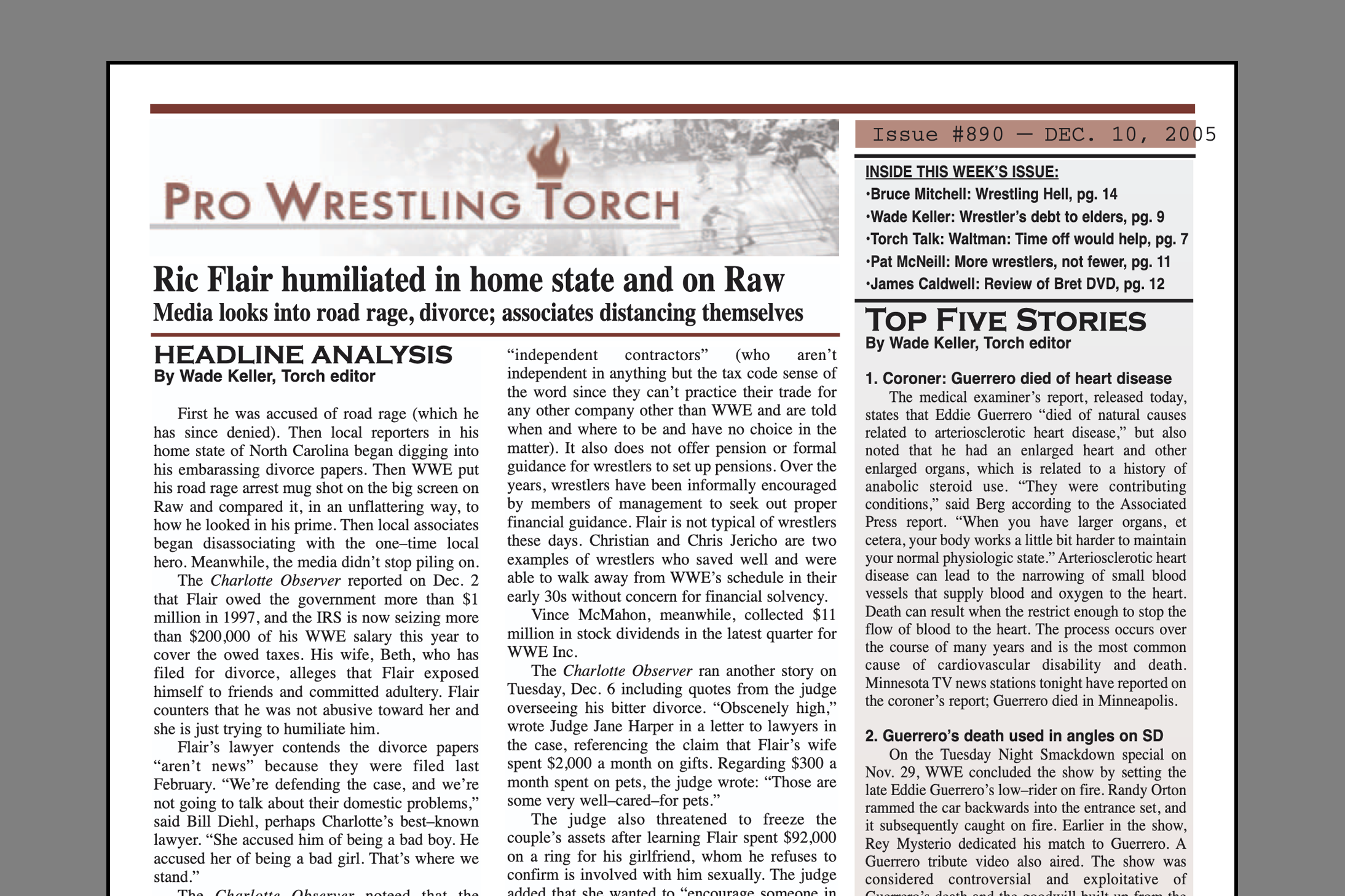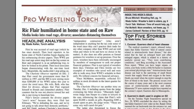 SUMMARY of #890 cover-dated December 10, 2005: This edition includes multiple perspectives, proposals, and analysis related to the death of Eddie Guerrero and the chances it should prompt in the industry. Bruce Mitchell’s feature column, titled “March 2006,” looks at the industry reaction to drug problems and why even since Guerrero’s death, there have been more strong signs that action is needed on the part of the industry leaders. Wade Keller’s feature column looks at how Ric Flair and Michael Hayes are walking examples of why major changes are needed in the industry… In part three of the “Torch Talk” with Sean Waltman, he addresses the issue of mandatory time off to save wrestlers’ lives and families, and also talks about his recent relapse… Pat McNeill’s feature column takes a practical look at mandatory time off for wrestlers, and how WWE is moving in the opposite direction to make it possible… Jason Powell’s feature column commends those close to Guerrero who took part in the tribute show… James Caldwell reviews Bret Hart’s DVD… Backtrack looks at a major uprising of wrestlers in WWE ten years ago… The Cover Story examines Ric Flair’s embarrassing past two weeks… Plus the Top Five Stories of the Week, TNA Newswire (including Dixie Carter’s oblivious reaction to questions about drug in TNA), WWE Newswire (including Kurt Angle addressing rumors regarding his health), ETC. Newswire, The Top Five Stories of the Week, and more…