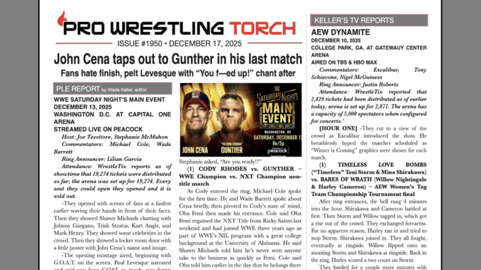 VIP NEWSLETTER – PRO WRESTLING TORCH #1950 (Dec. 17, 2025): Saturday Night’s Main Event report, analysis of Cena’s final match, Parks column overview on Cena retirement year, Fann column on AEW-ROH dynamic