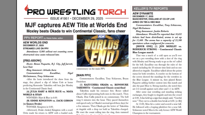 SUMMARY: This week’s PWTorch Newsletter features Wade Keller’s AEW Worlds End report and Sean Radican’s review… Alan “4L” Counihan feature column on Hiroshi Tanahashi’s legacy as he heads to his retirement match next week… Greg Parks feature column reviewing Gorilla Monsoon biography… Keller’s TV reports… More…
