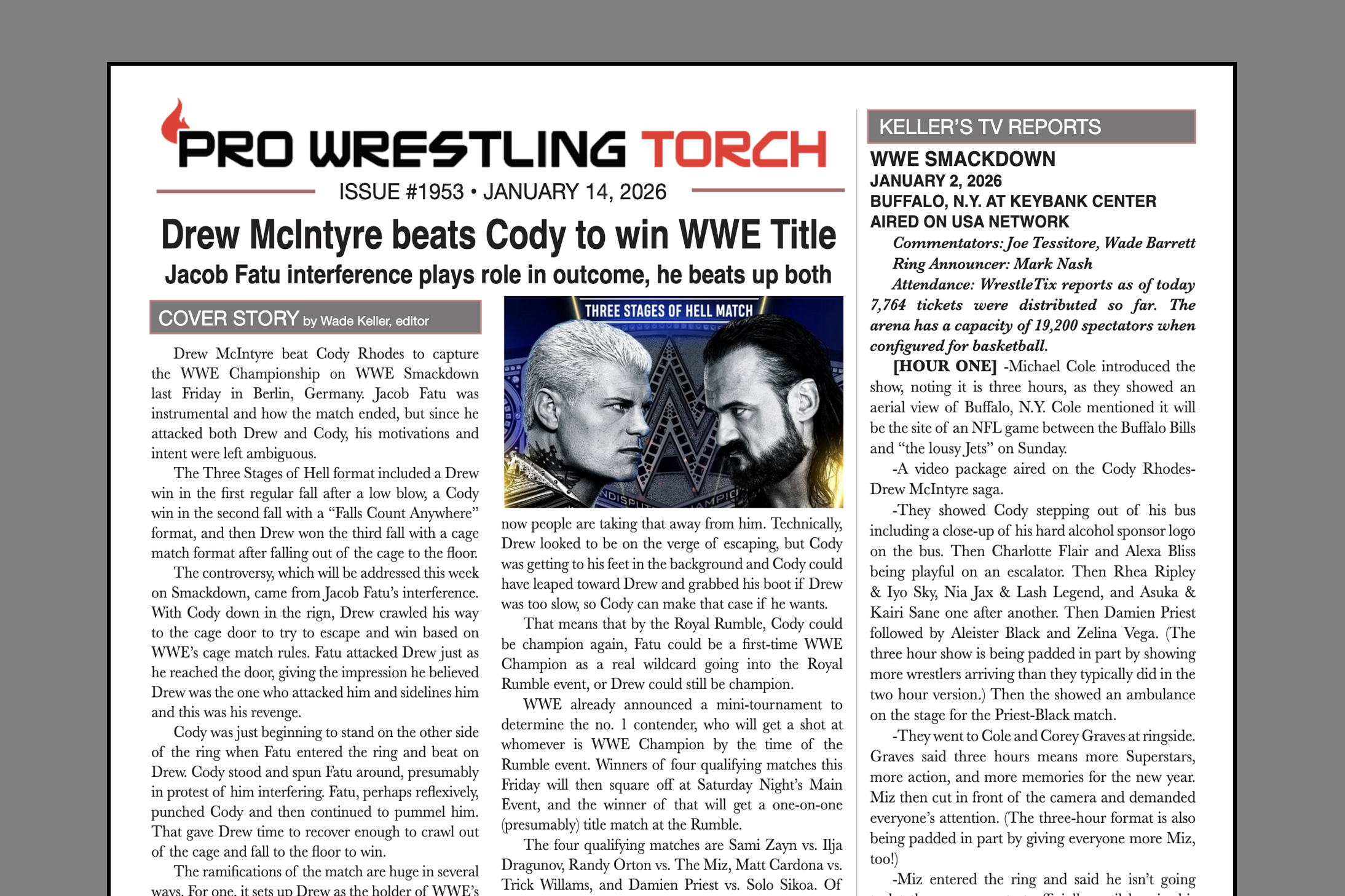 VIP NEWSLETTER – PRO WRESTLING TORCH #1953 (Jan. 14, 2026): Keller’s cover story on McIntyre’s WWE Title win over Cody, Greg Parks feature column with his 2025 Parksy Awards, Keller’s TV reports