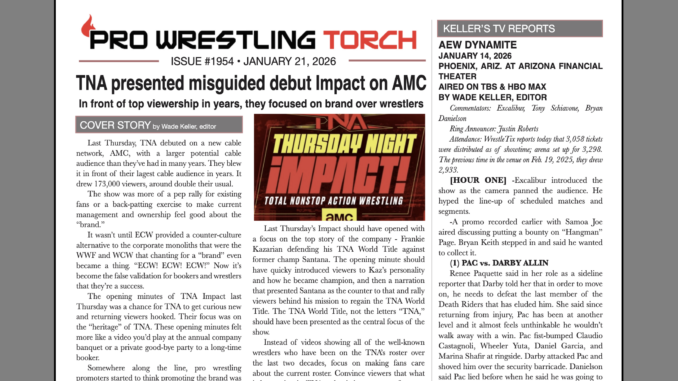VIP NEWSLETTER – PRO WRESTLING TORCH #1954 (Jan. 21, 2026): Keller’s cover story on TNA Impact’s debut on AMC, Parks looks at WrestleKingdom and New Year Dash, TV reviews, End Notes, Newswire