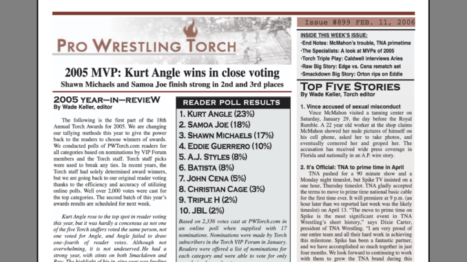 SUMMARY of #899 cover-dated February 11, 2006: This issue includes the first part of the 2006 Torch Awards including MVP, Best Wrestler, Best Heel, Best Babyface, Best Feud, Best PPV, and Best TV Series, featuring reader results, staff picks and comments, and Keller’s analysis of the results… The Specialists present their top picks for MVPs in each of their respective promotions… Wade Keller’s End Notes looks at the potential ramifications of the Vince McMahon tanning salon story… Plus WWE Newswire, TNA Newswire, ROH Newswire, On Point Interview with Austin Aries, Backtrack with quotes from Paul Heyman to the Torch, The Big Story on Raw, Smackdown and Impact, and more.
